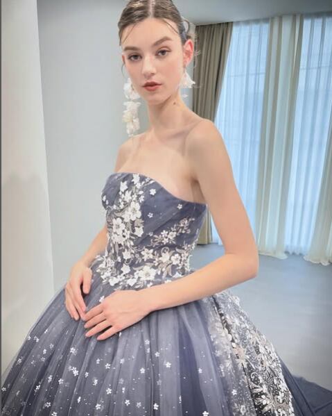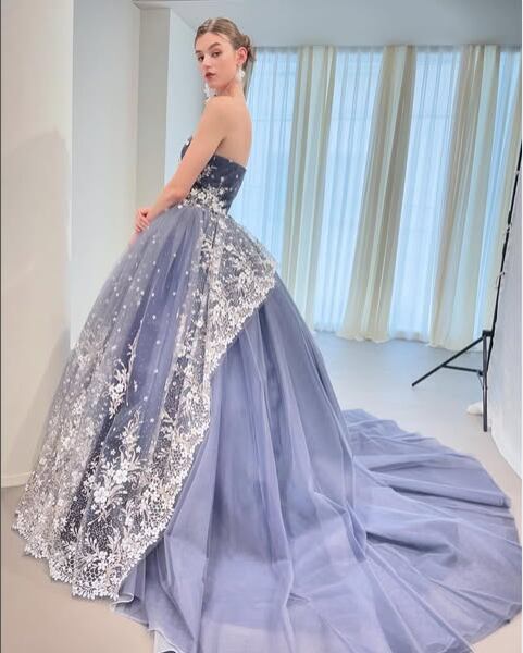 美品!ダークブルカラードレス レースアップリケ フラワーモチーフ刺繡 レーススカート パーティードレス ボリュームドレス【色変更可能】