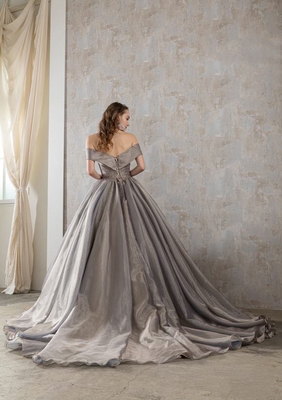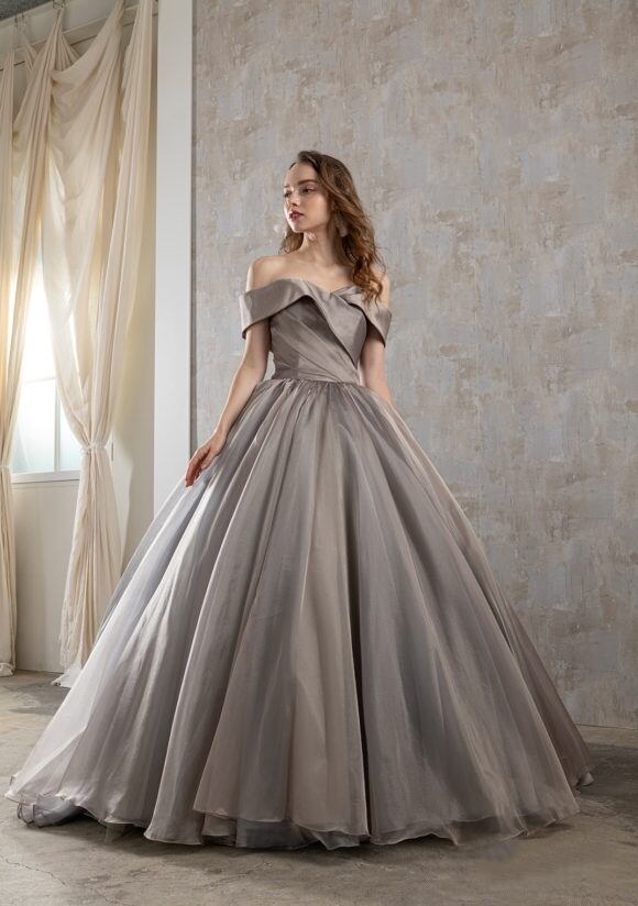 美品!カーキブラウン カラードレス 上質オーガンジー プリンセスライン オフショルダー パーティードレス ダンスドレス【色変更可能】