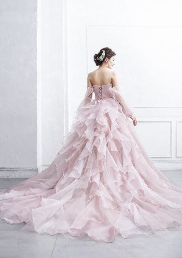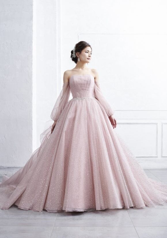 豪華!薄ピンクカラードレス ひらひらフリルトレーン ロング袖 キラキラグリッターチュール シャーリング編み上げ パーティードレス【色変更可能】
