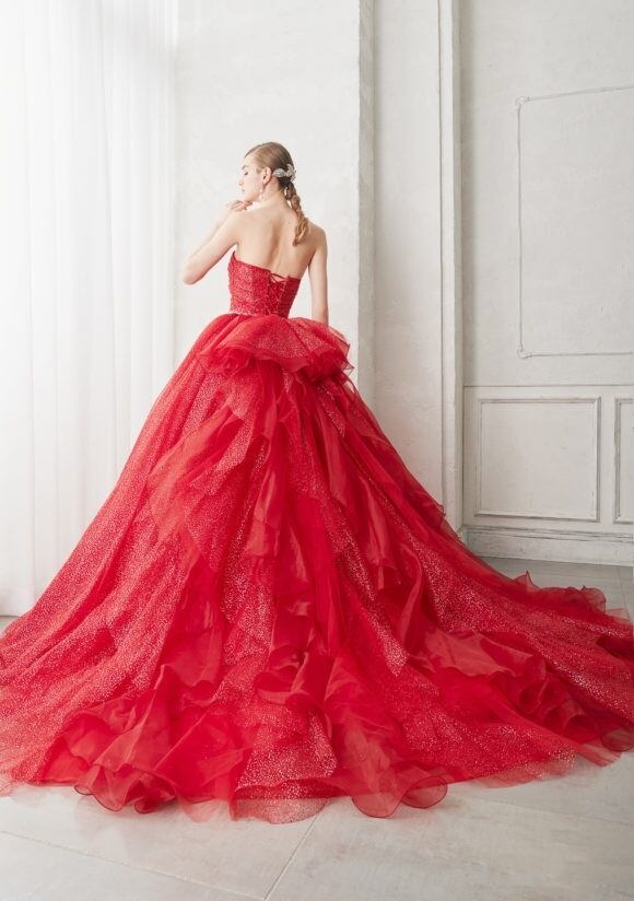 豪華!鮮やかなレッドカラードレス 赤 ひらひらフリルトレーン キラキラグリッターチュール シャーリング編み上げ式 パーティードレス【色変更可能】