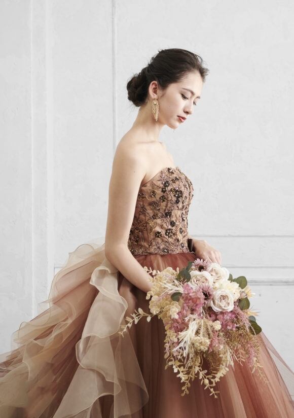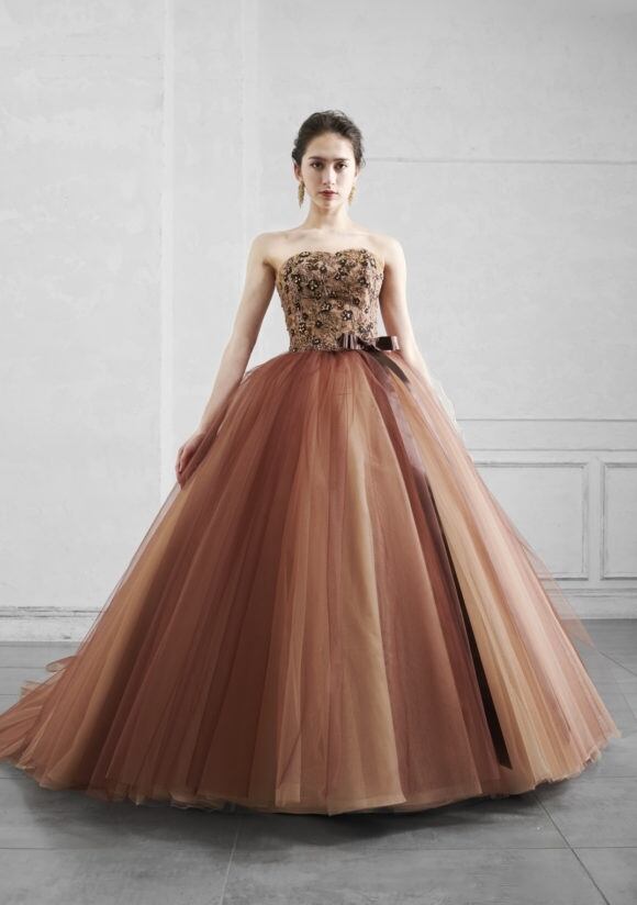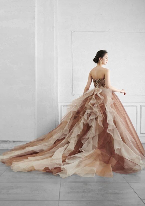 豪華!ブラウンカラードレス ひらひらフリルトレーン レースアップリケ シャーリング編み上げ式 パーティードレス【色変更可能】