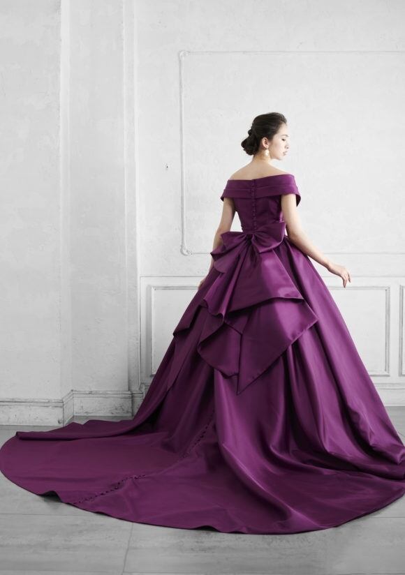 美品!濃い紫色 パープルカラードレス オフショルダー ひらひらバックリボン プリンセスライン パーティードレス 前撮り【色変更可能】