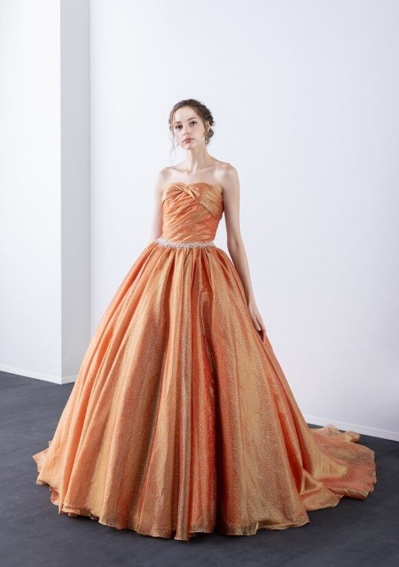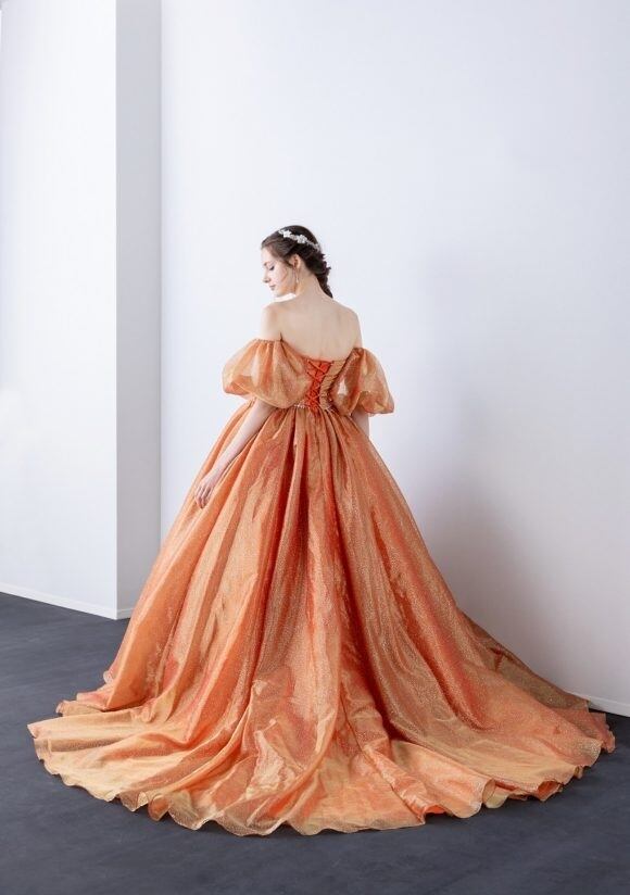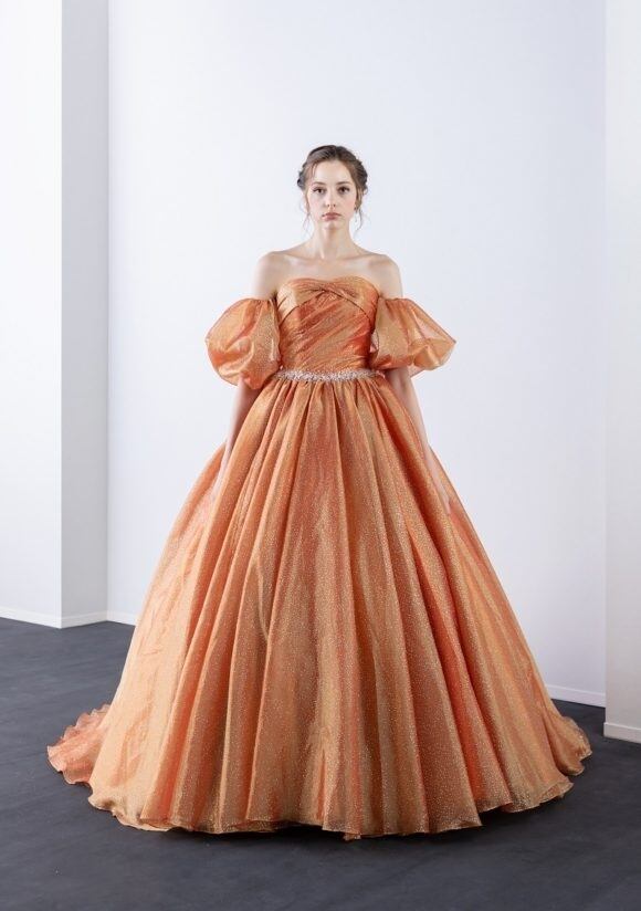 美品!オレンジカラードレス パフスリーブ キラキララメ 上質オーガンジー パーティードレス ミディアムドレス 前撮り【色変更可能】