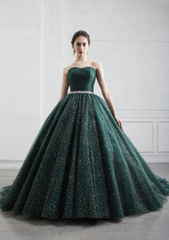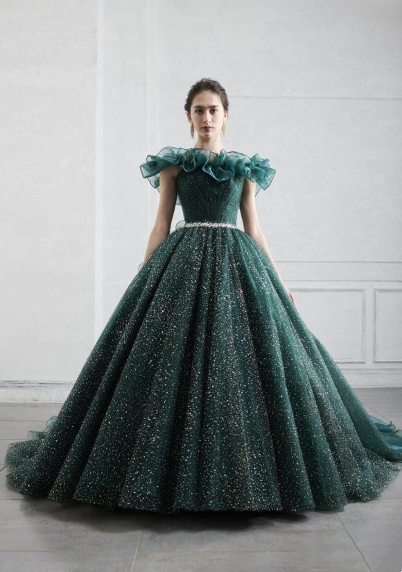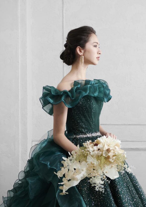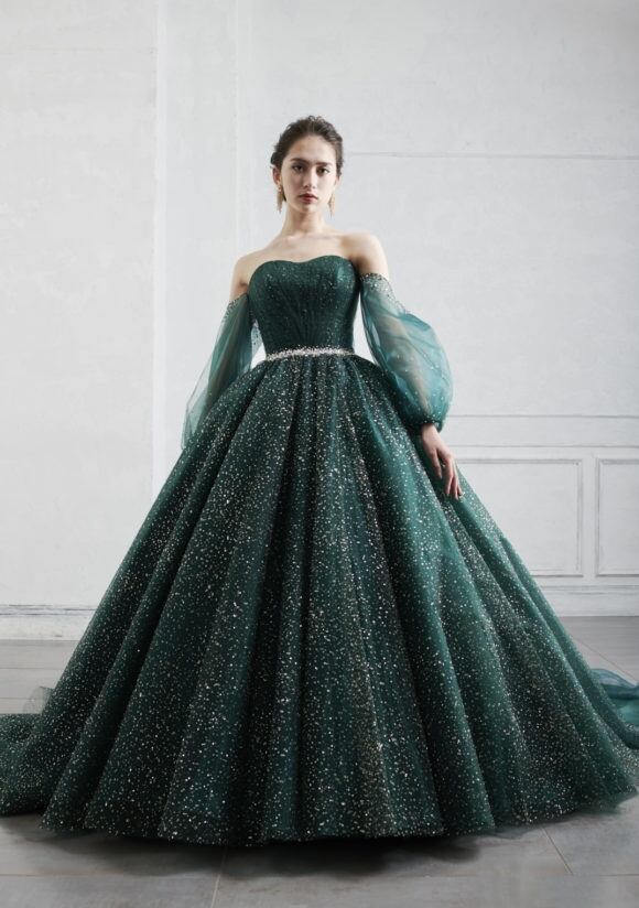 豪華!フォレストグリーンカラードレス ひらひらフリルトレーン 付け袖 オフショルダー キラキラグリッターチュール シャーリング編み上げ式 パーティードレス【色変更可能】