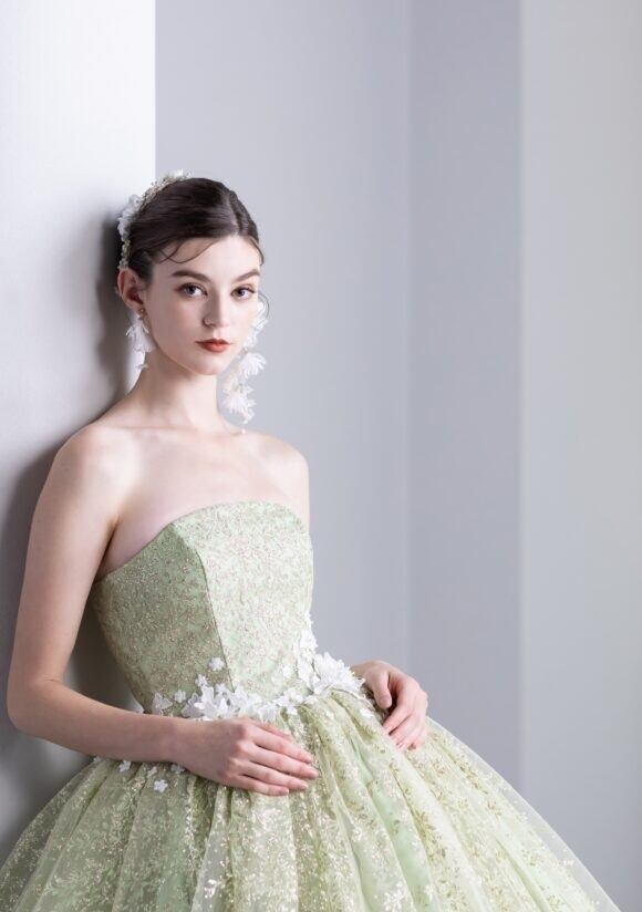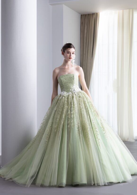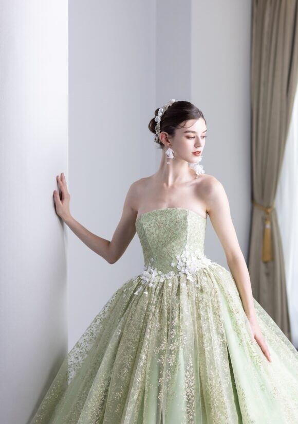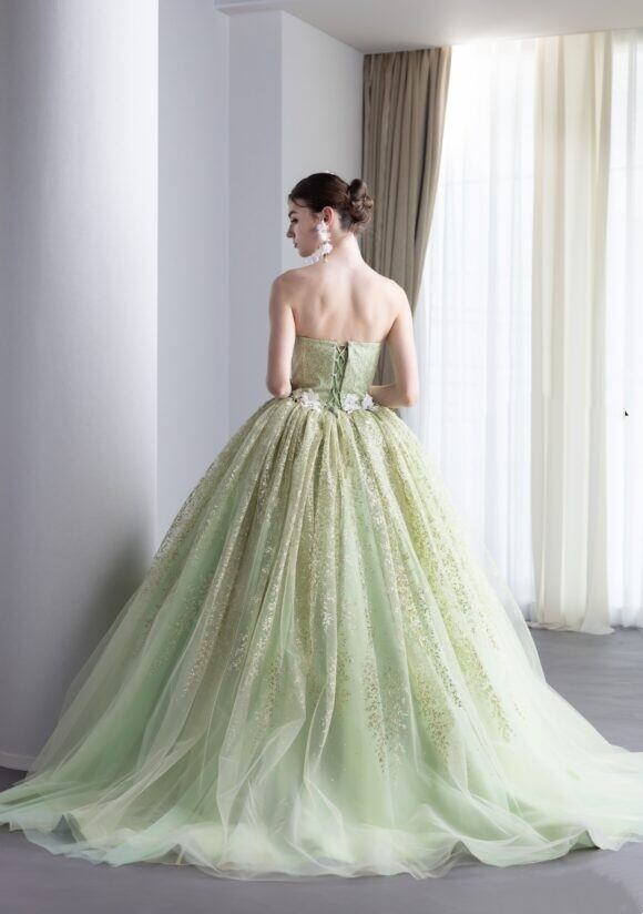 上品!グリーンカラードレス レースアップリケ ふんわりチュールドレス プリンセスライン パーティードレス 演奏ドレス【色変更可能】