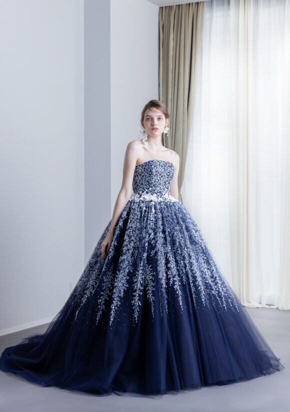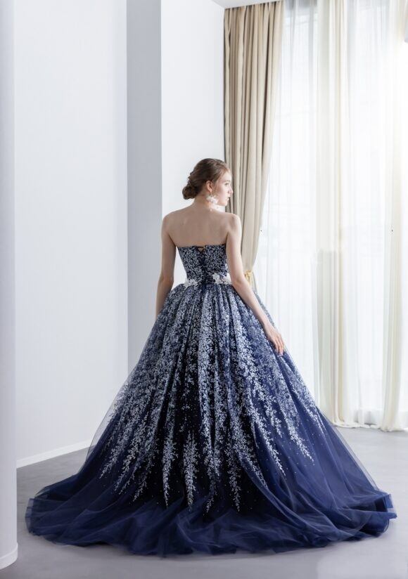上品!ネイビーブルーカラードレス レースアップリケ ふんわりチュールドレス プリンセスライン パーティードレス 演奏ドレス【色変更可能】