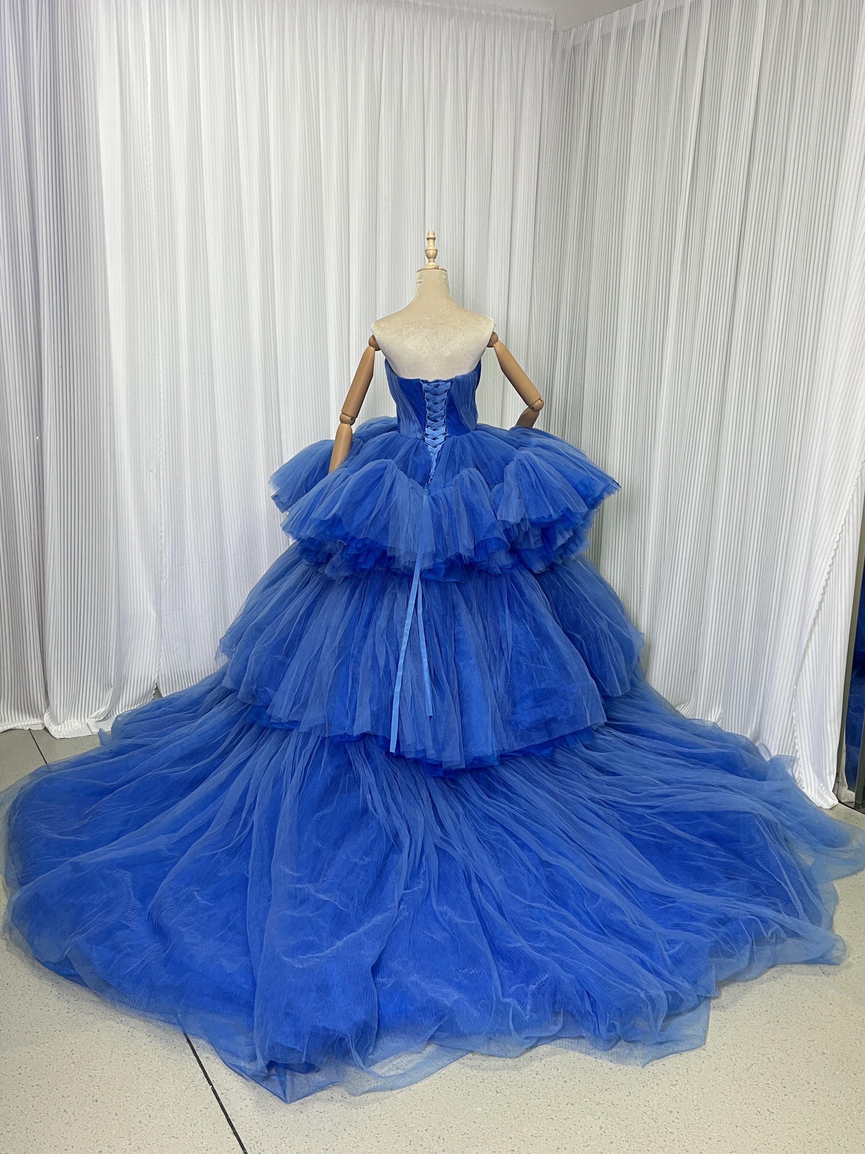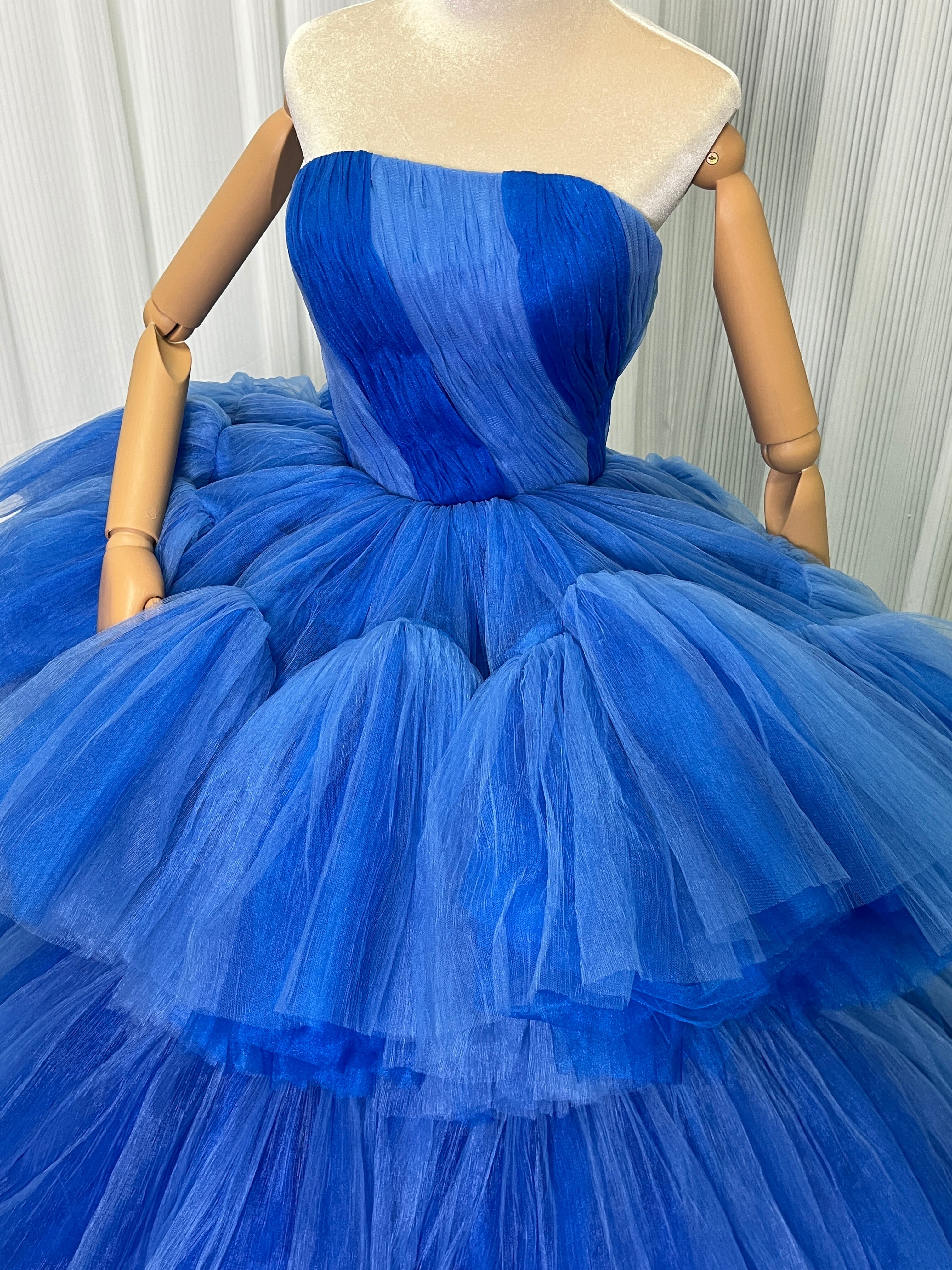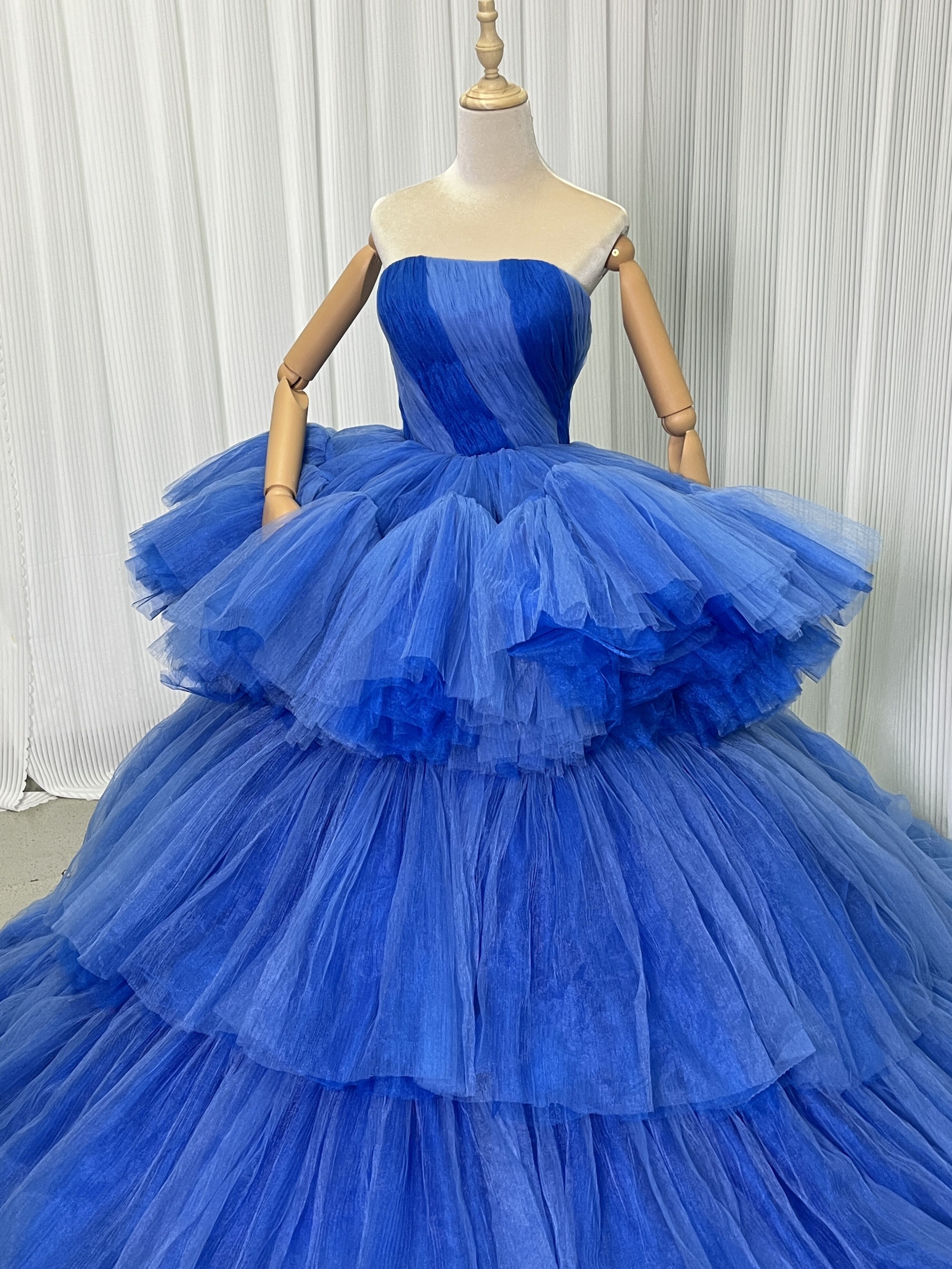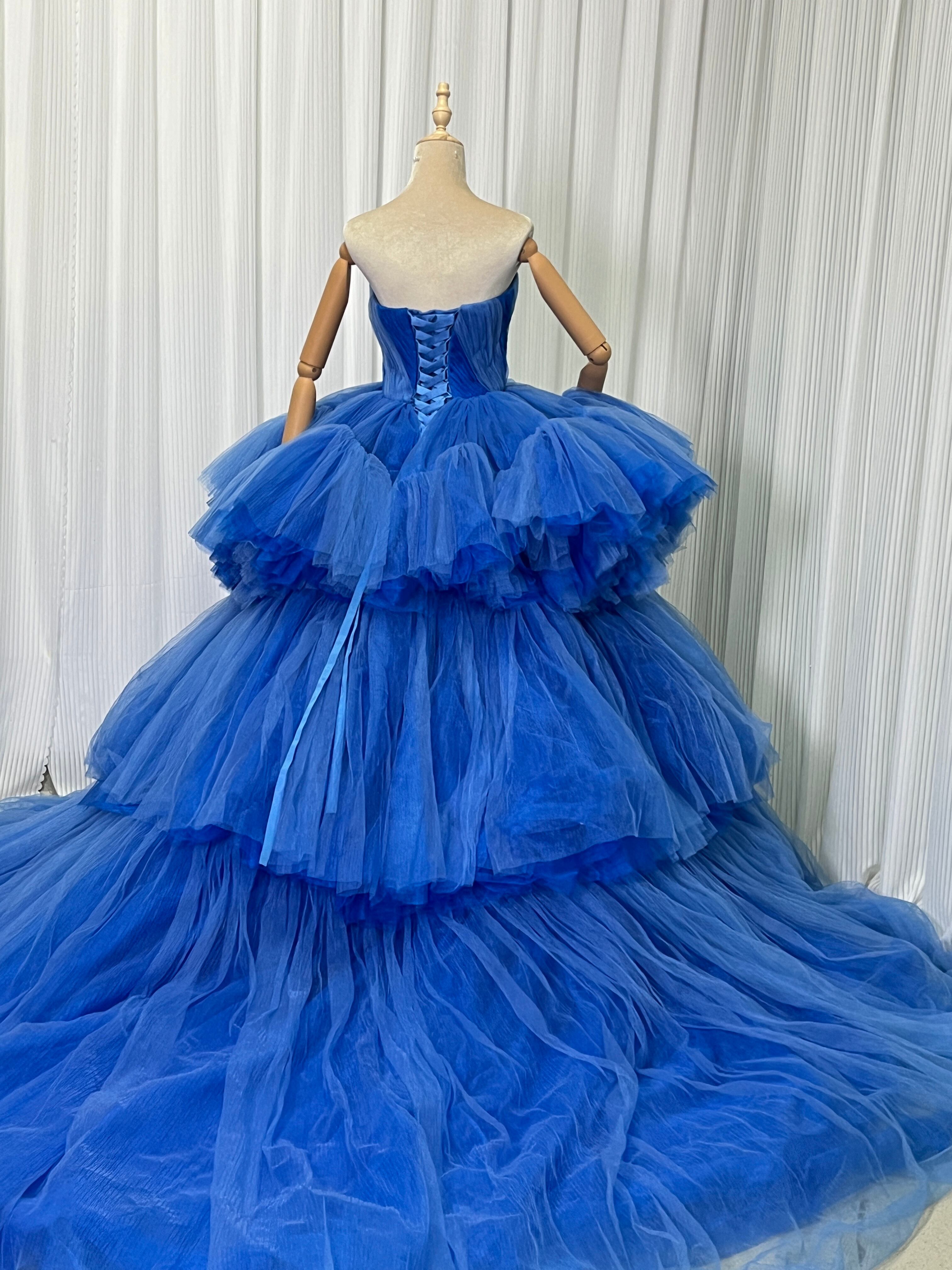人気上昇!青 もこもこ カラードレス チュールドレス ビスチェスタイル ティアードドレス/前撮り/花嫁/結婚式