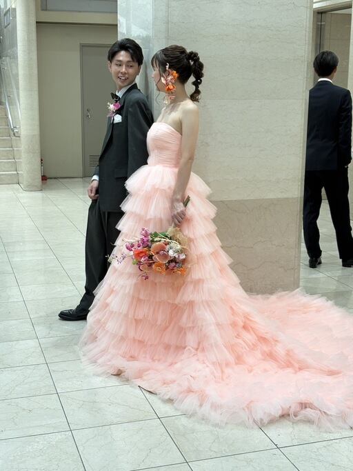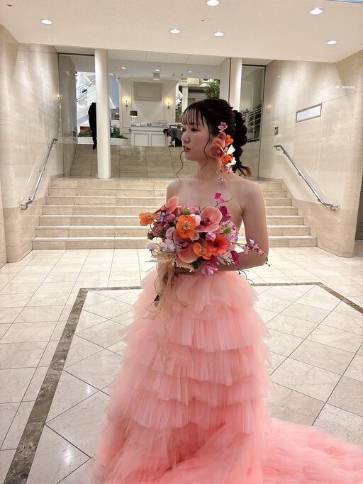 実例写真 ピンク ラッフルフリル カラードレス ふわふわオフショルダー もこもこチュールドレス パーティードレス フリルドレス【色変更可能】
