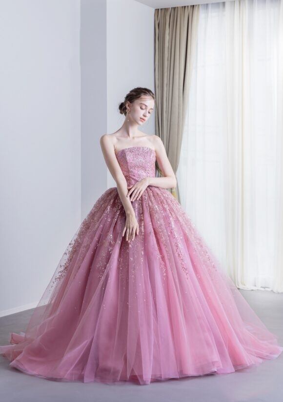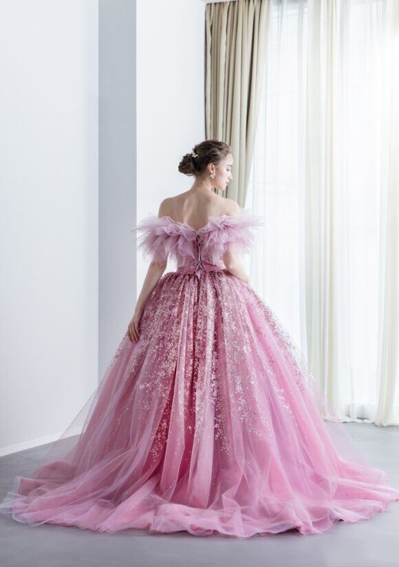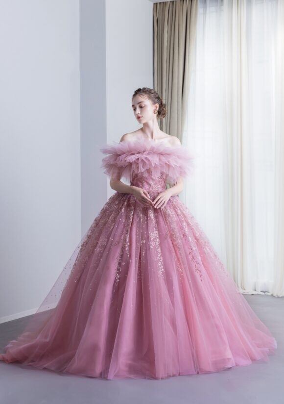 上品!チェリーピンクカラードレス フリルオフショルダー シャーリング編み上げ プリンセスライン パーティードレス 演奏ドレス【色変更可能】