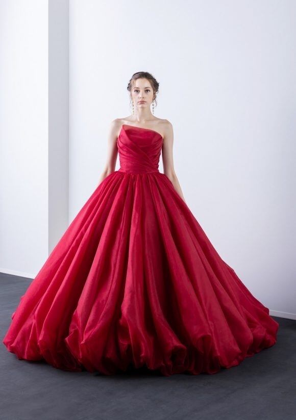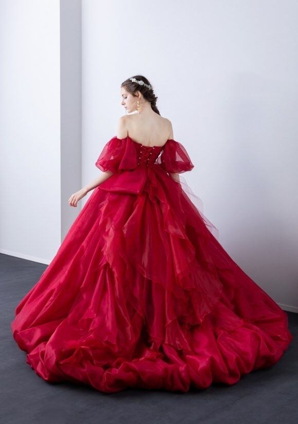 美品!ビビッドレッドカラードレス フリルトレーン パフスリーブ バルーンスカート 上質オーガンジー ダンスドレス パーティードレス 前撮り【色変更可能】