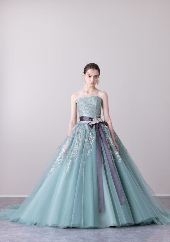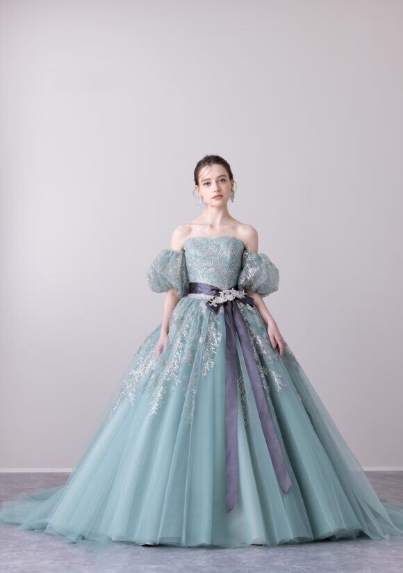 上品!ライトスカイブルーカラードレス レースアップリケ ウエストリボン パフスリーブ パーティードレス 演奏ドレス【色変更可能】