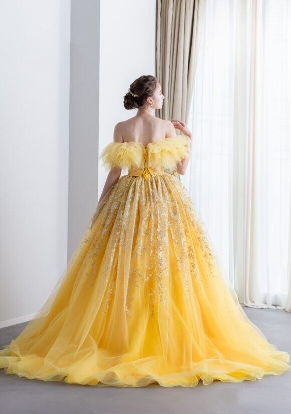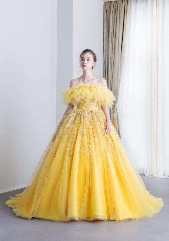 上品!ビビッドイエローカラードレス フリルオフショルダー シャーリング編み上げ プリンセスライン パーティードレス 演奏ドレス【色変更可能】