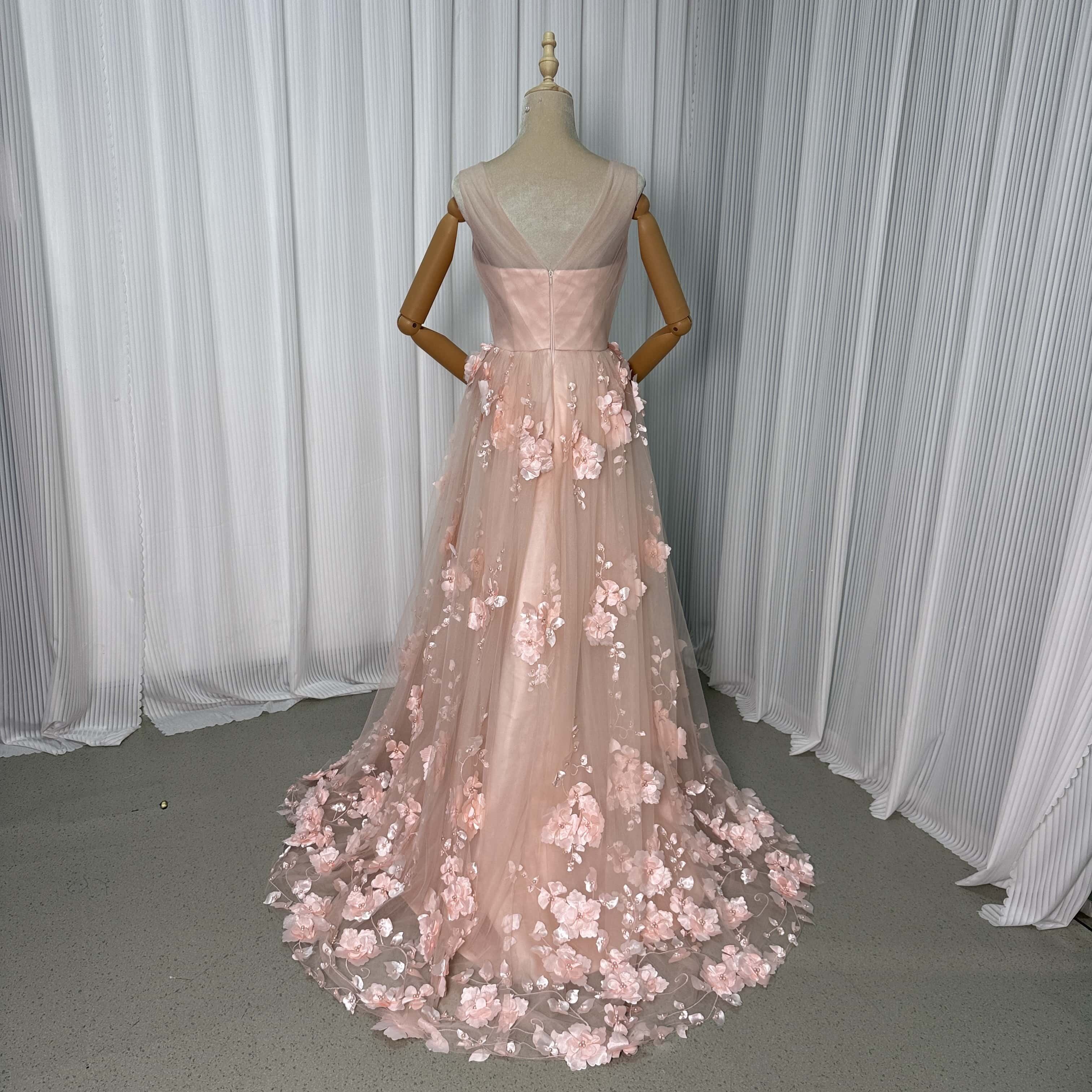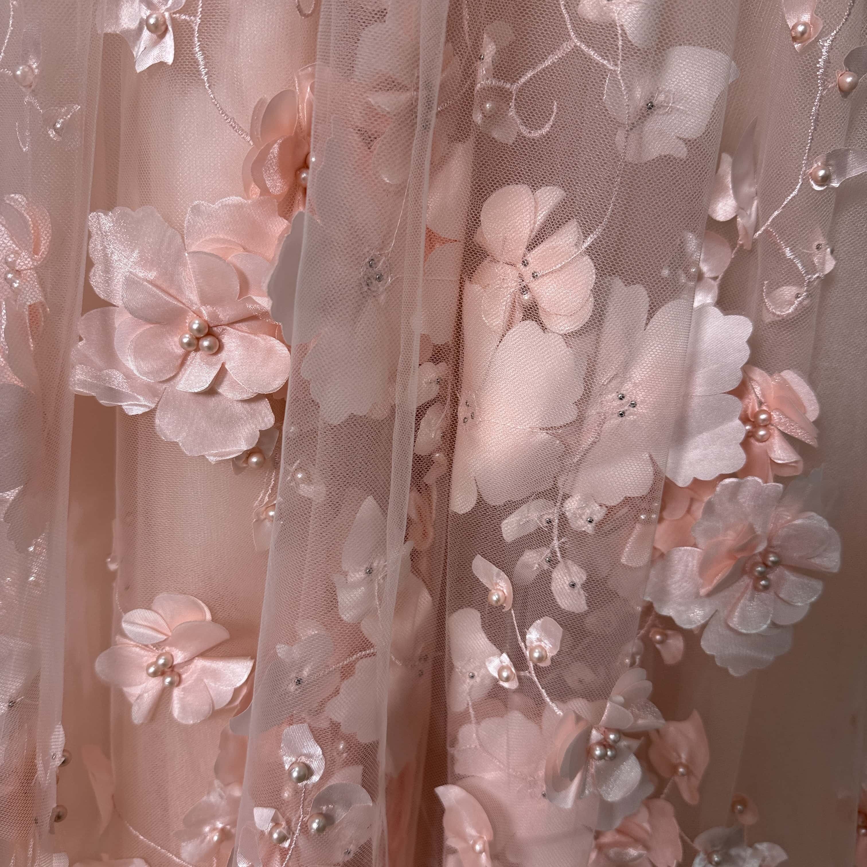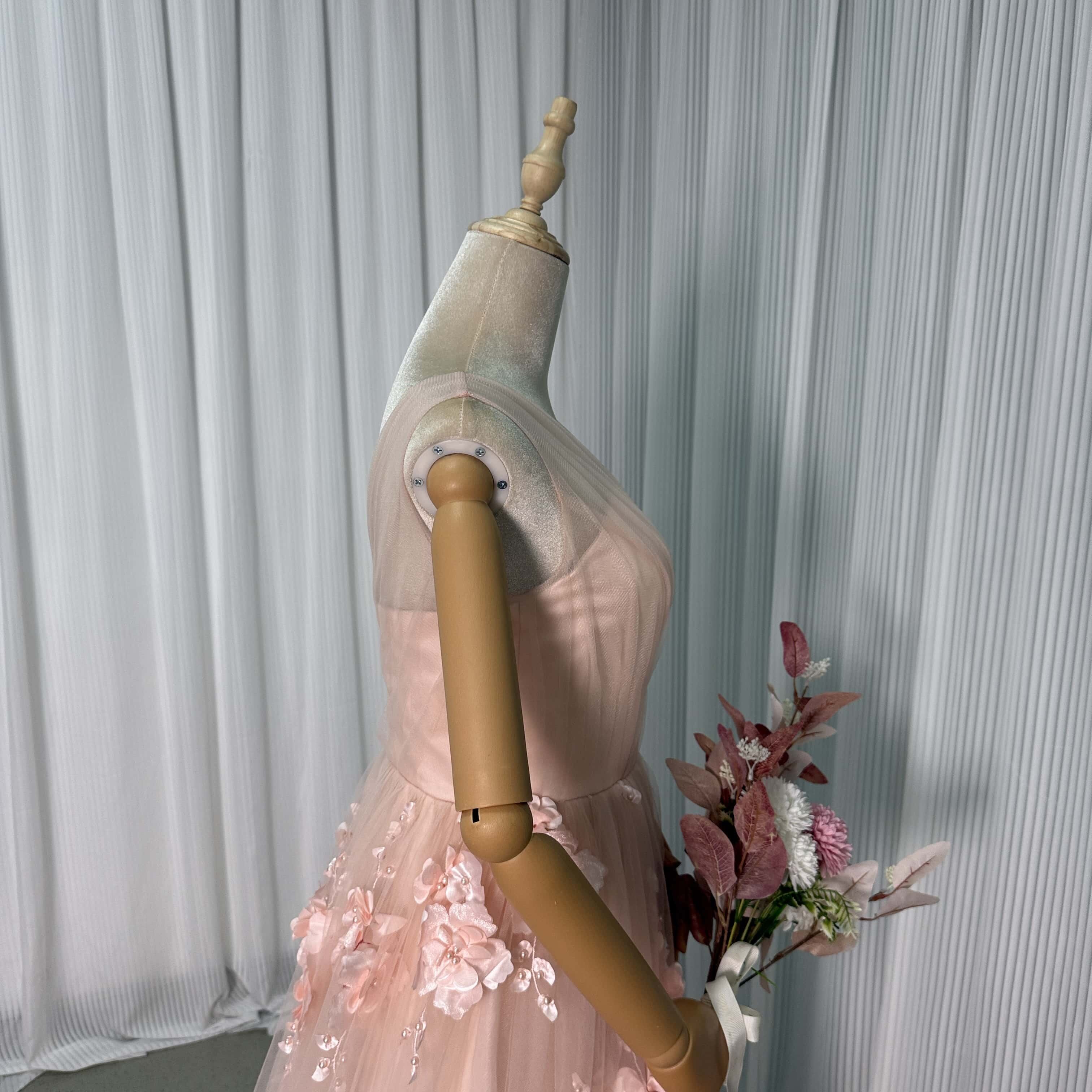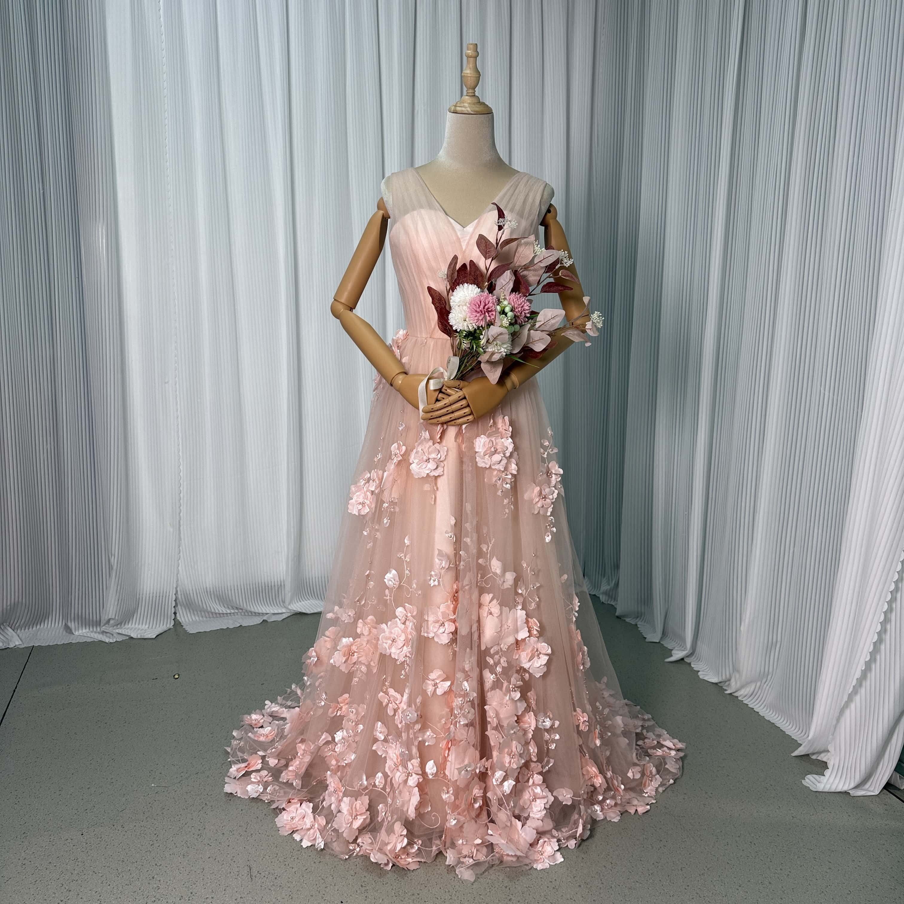 美品!ピンク カラードレス 3D立体レース刺繍 ソフトチュール パーティードレス2次会 前撮り 花嫁 挙式