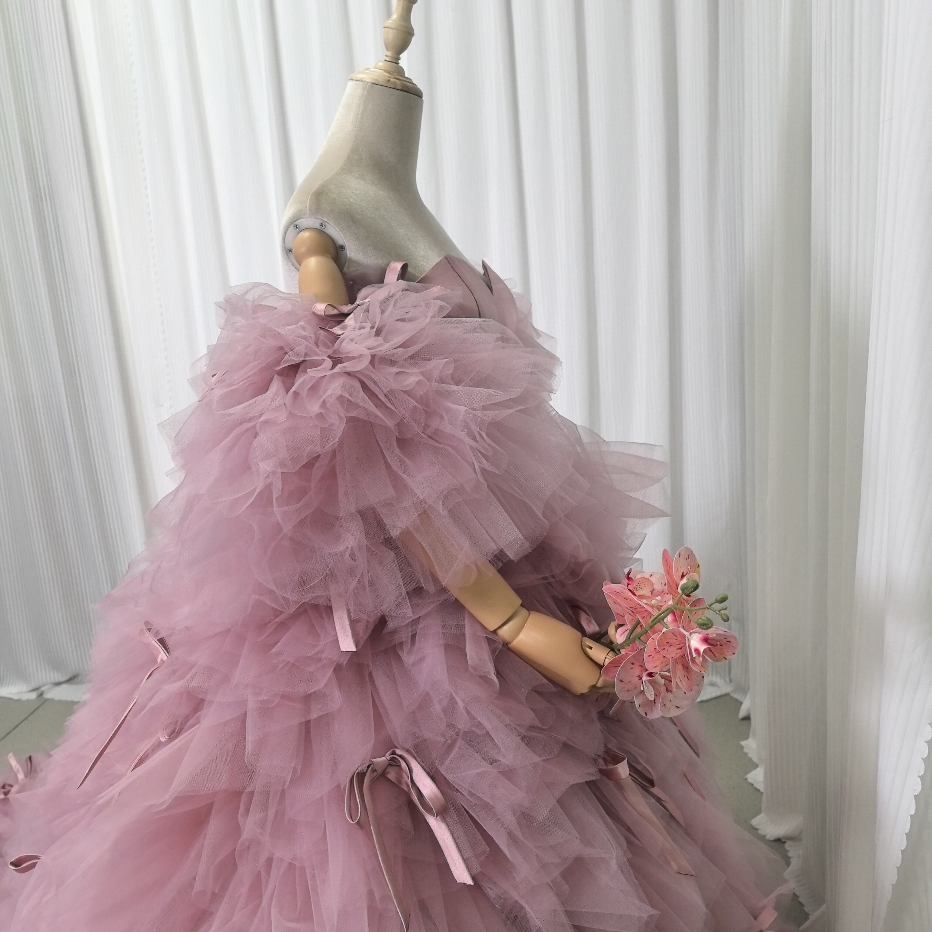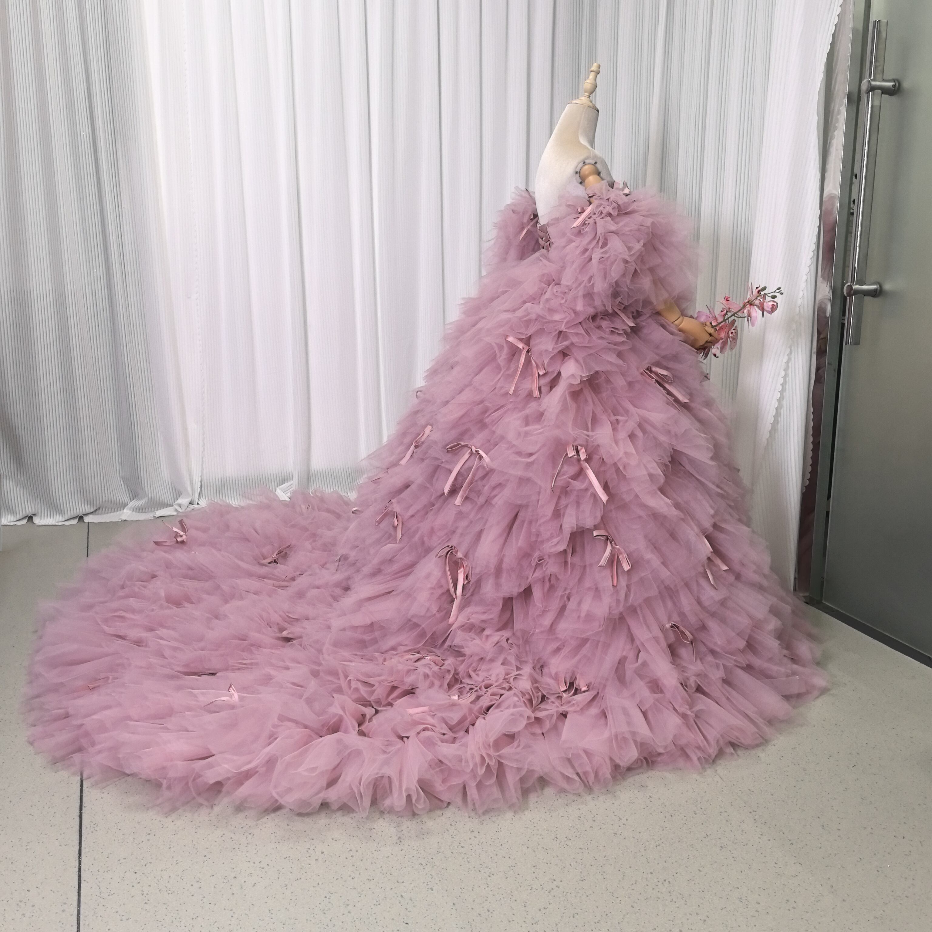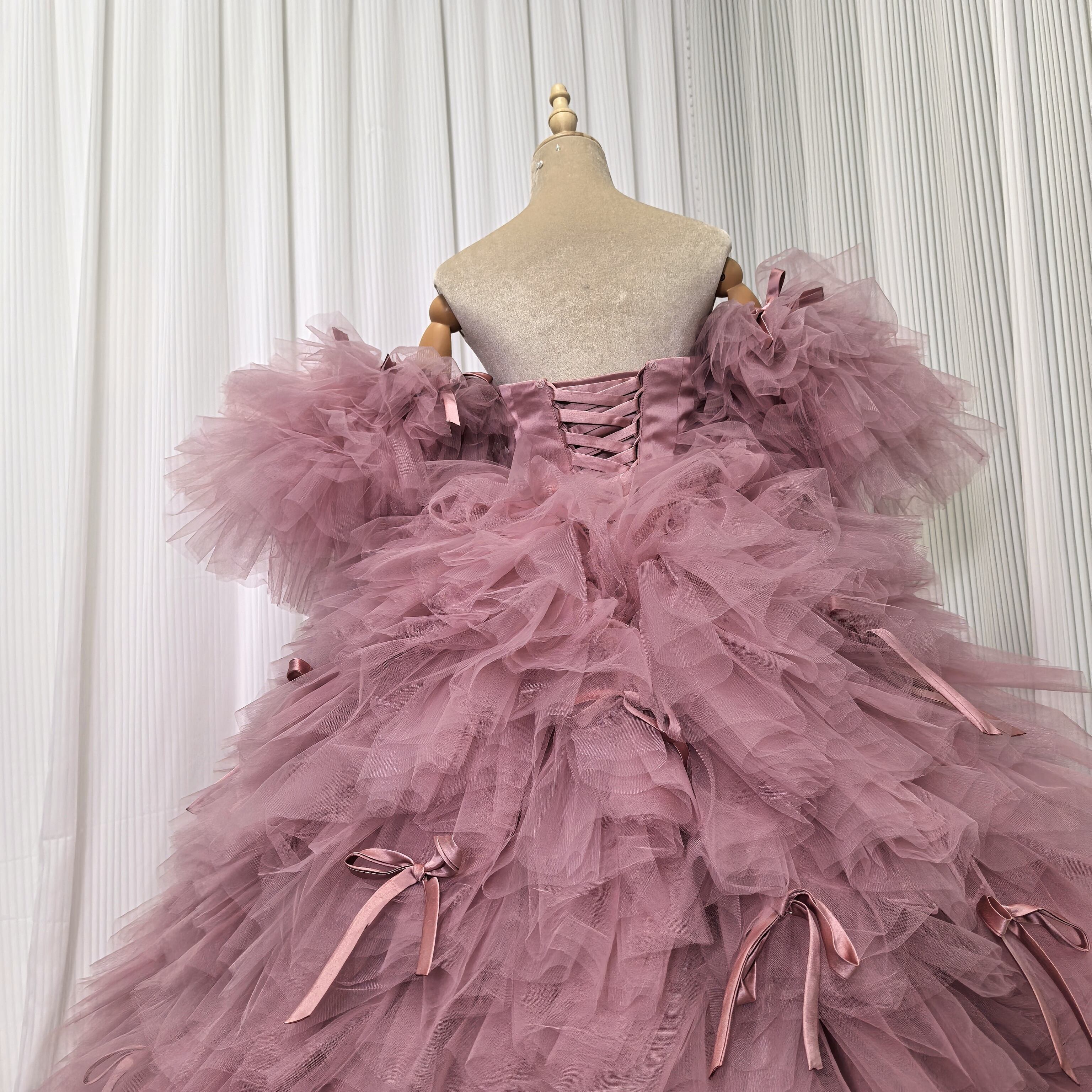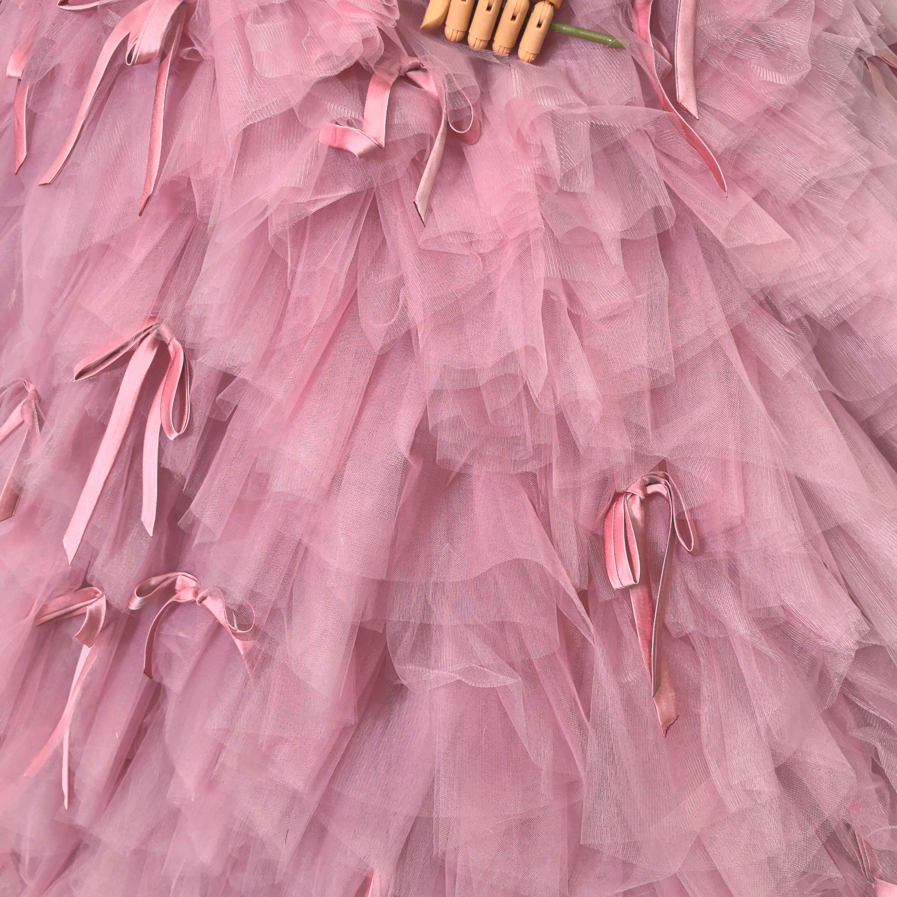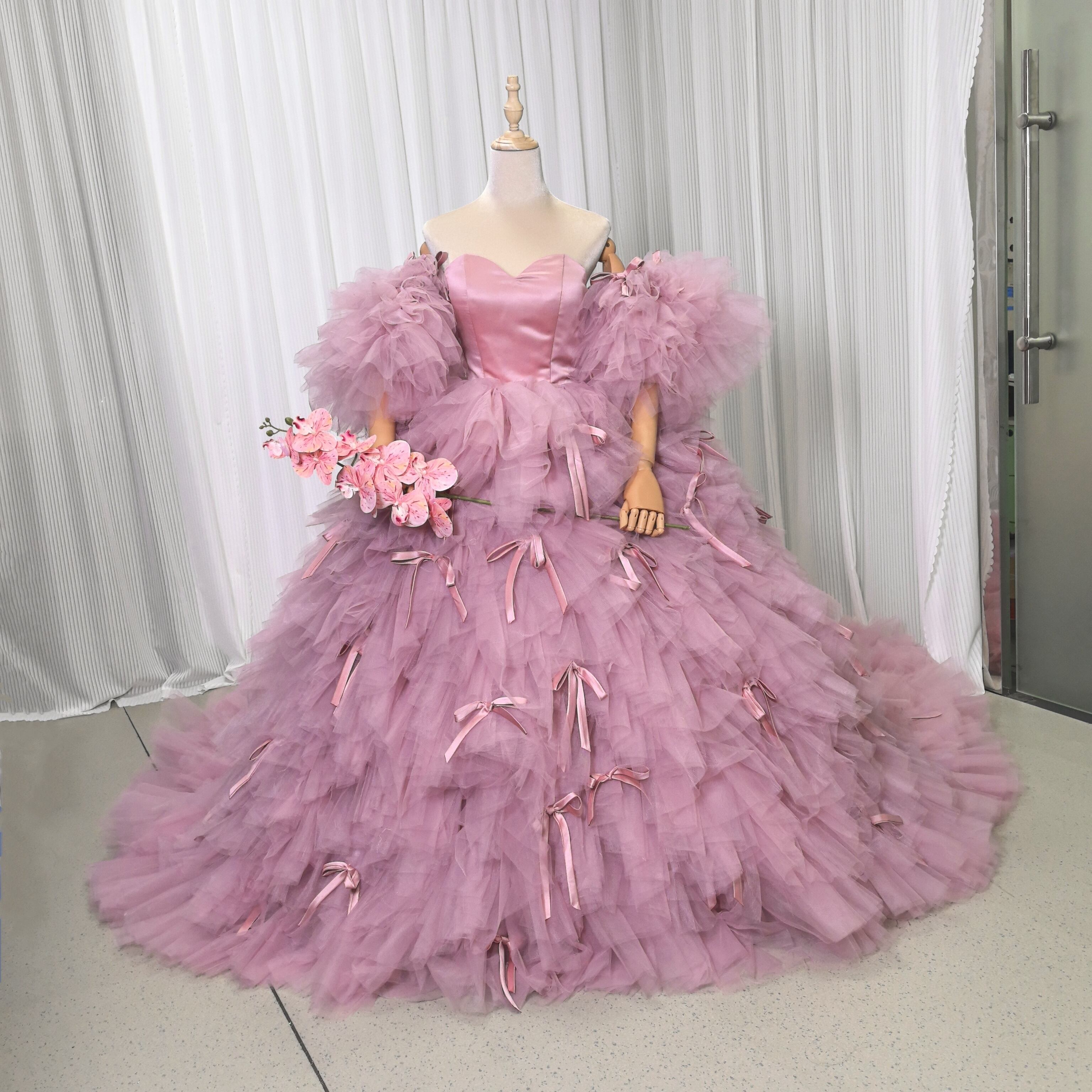 もこもこピンクカラードレスチュールドレス 取り外し袖 フリルオフショルダー お色直し ふわふわ ボリュームドレス