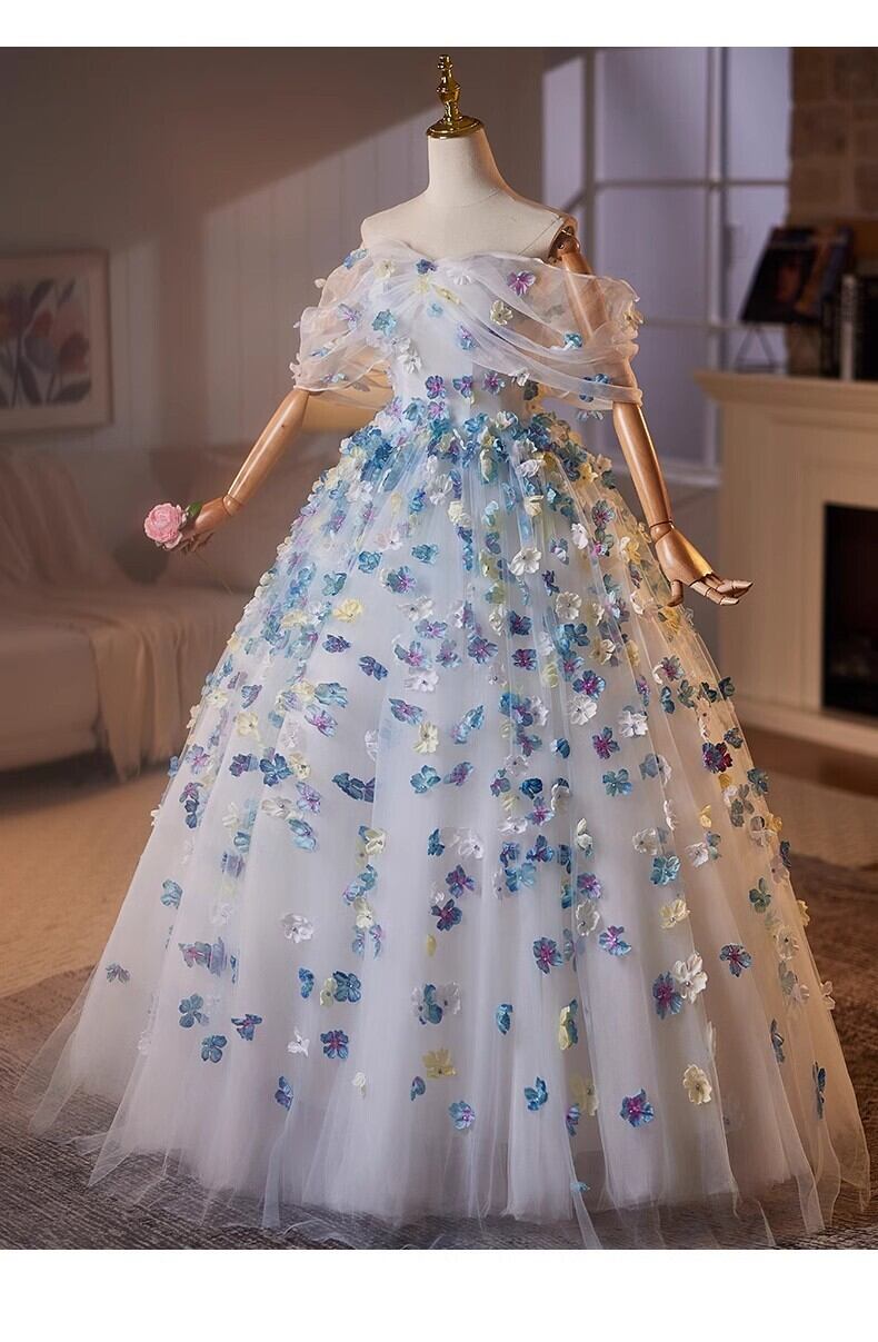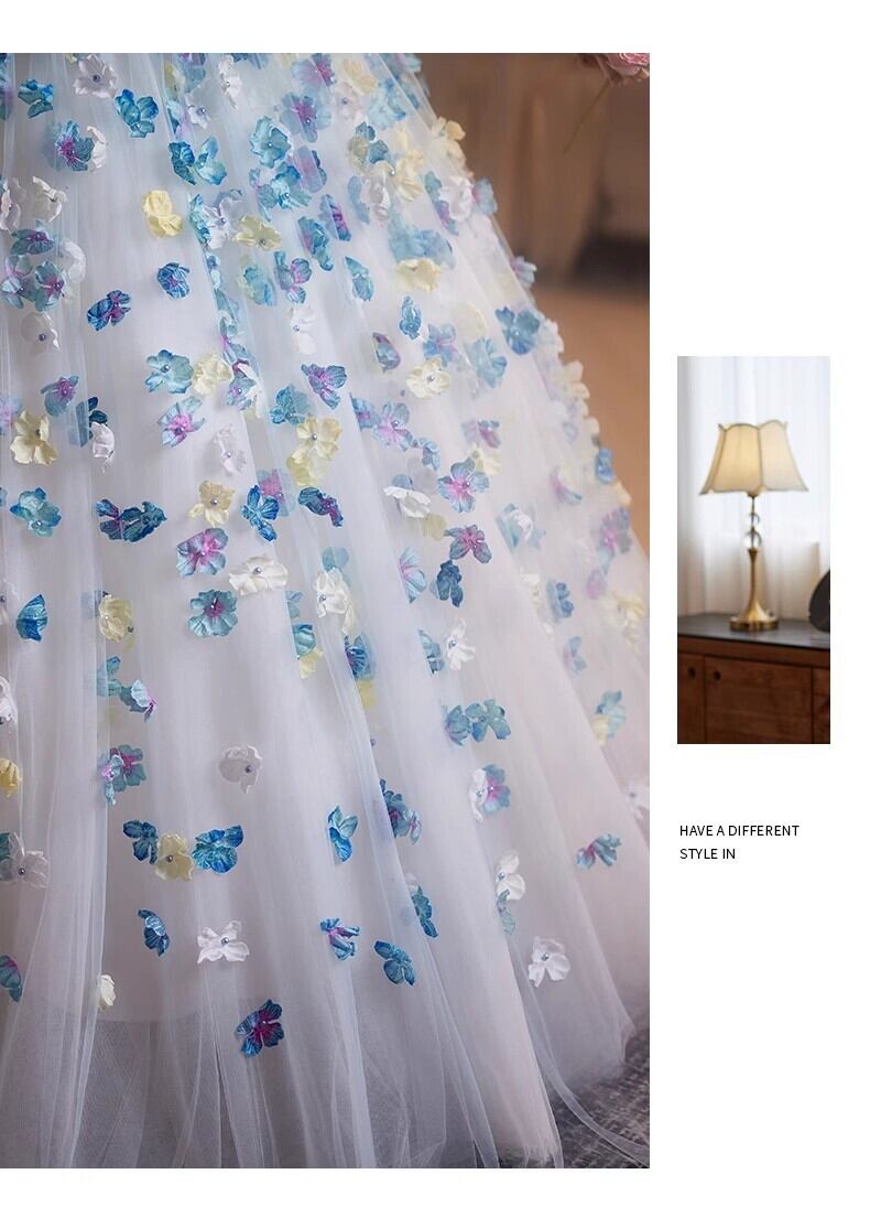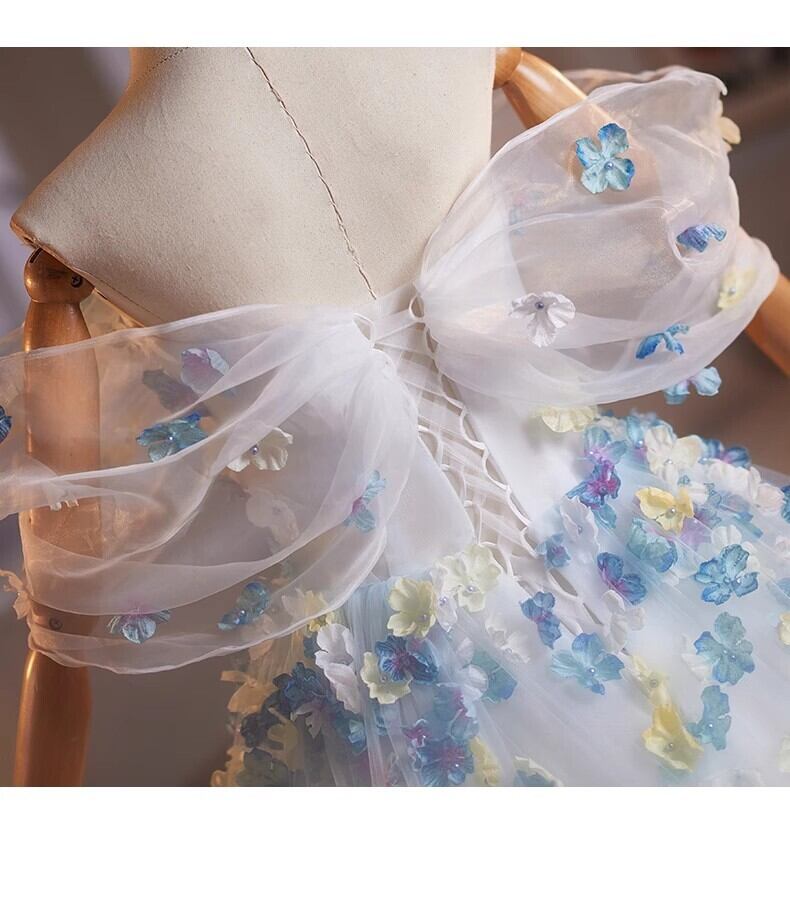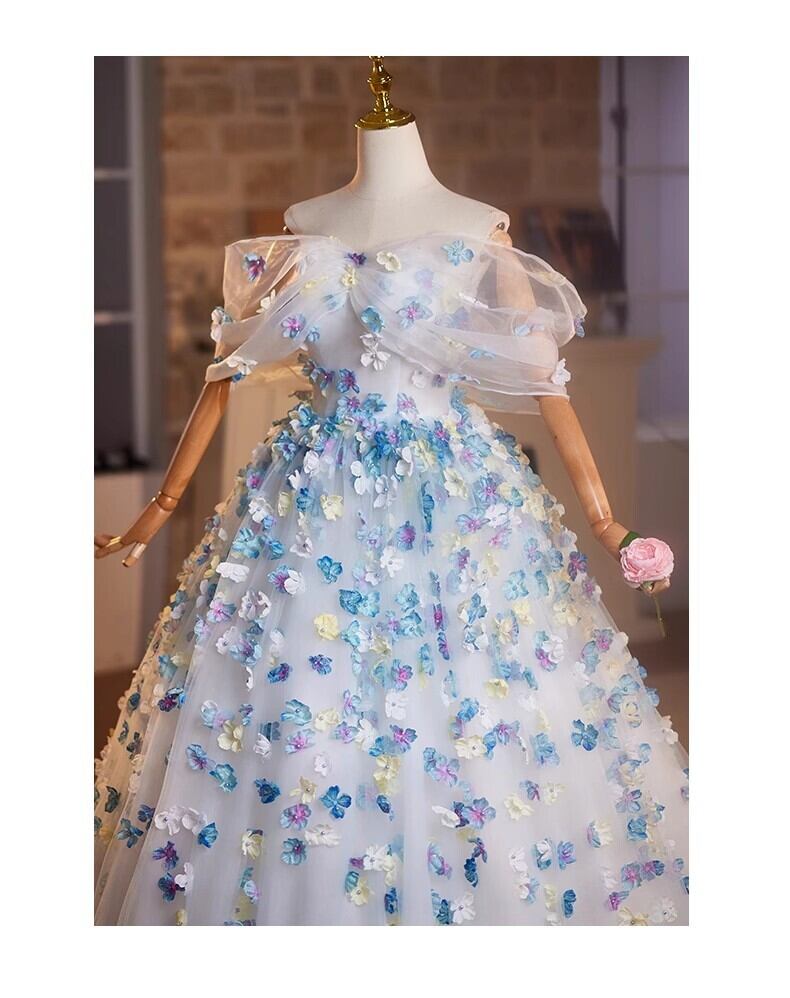 美品!カラードレスオフショルダー 3D立体レース刺繍 リボン ソフトチュール パーティードレス2次会 前撮り 花嫁 挙式