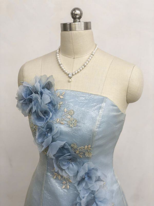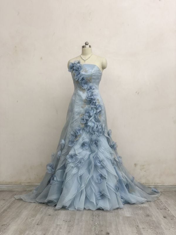 美品!パーティードレス ライトスカイブルーカラードレス 3Dアップリケ ラッフルフリル コンサートドレス マーメイドドレス【色変更可能】