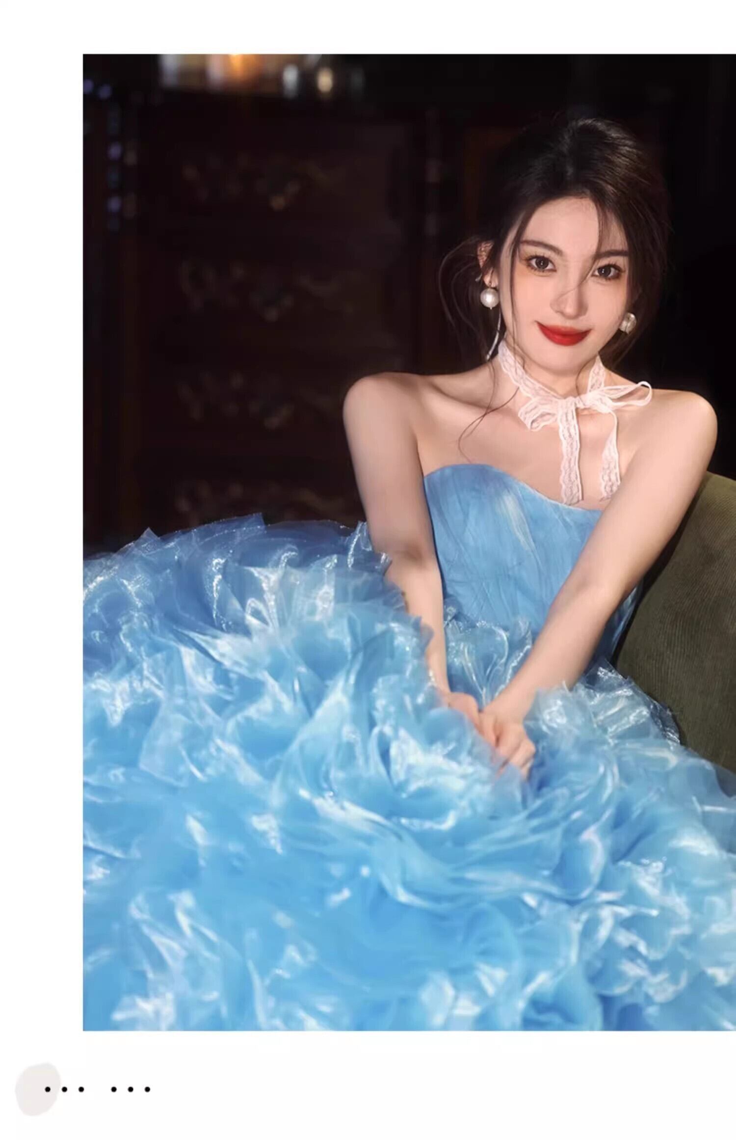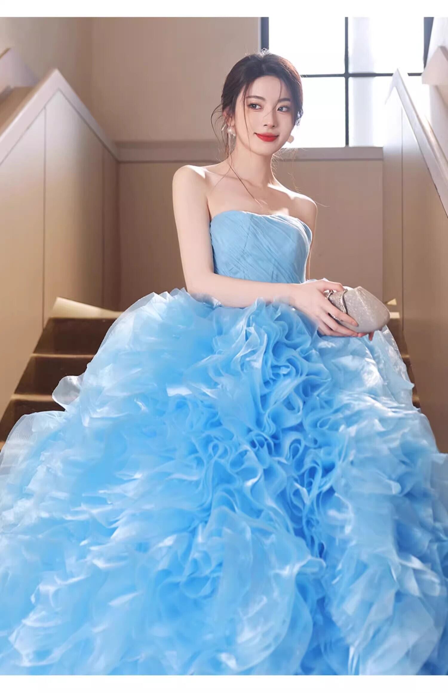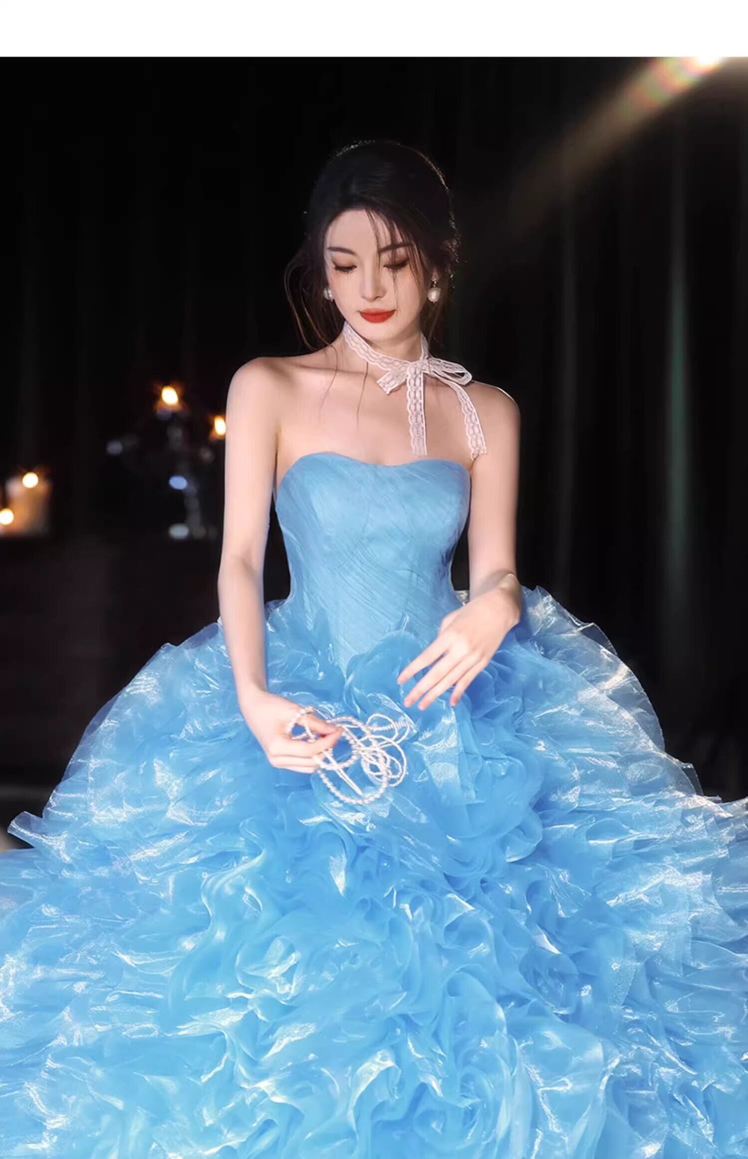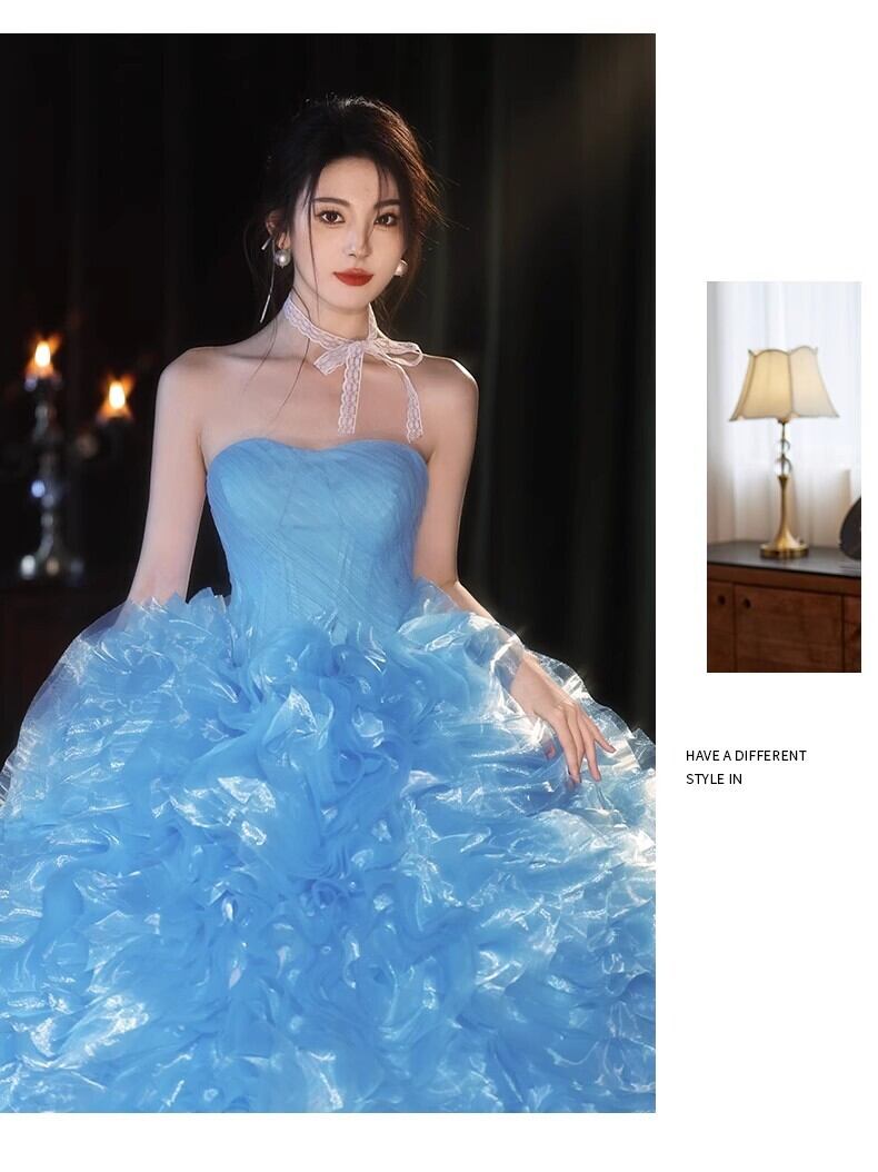 爽やかで優しいブルー もこもこピンクカラードレスチュールドレス フリルオフショルダー お色直しふわふわ ボリュームドレスフレアスカート