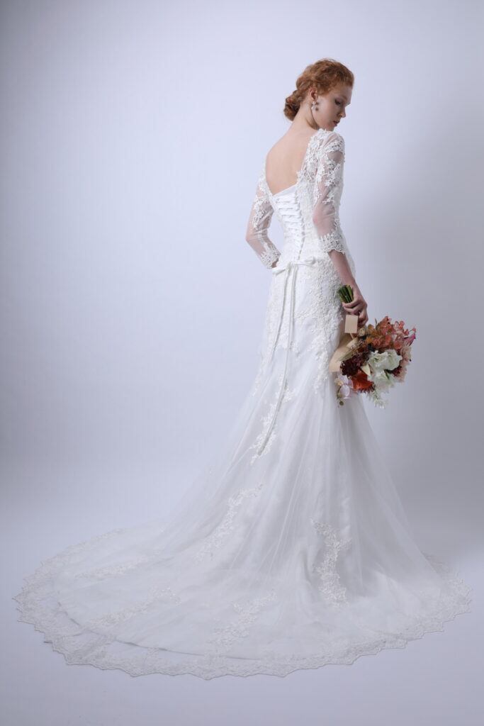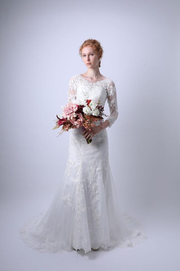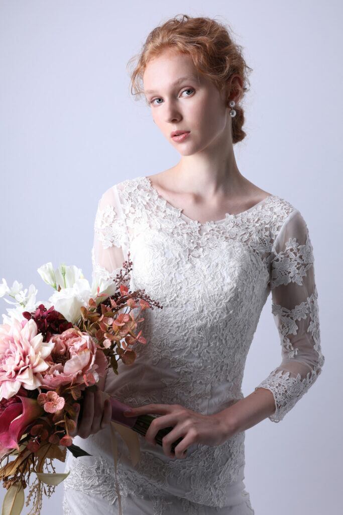 美品!七分袖 ウエディングドレス ソフトマーメイド 繊細レースアップリケ 総レースドレス 美しいボディライン ミディアムドレス パーティードレス