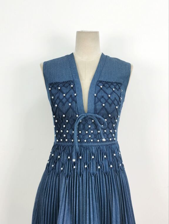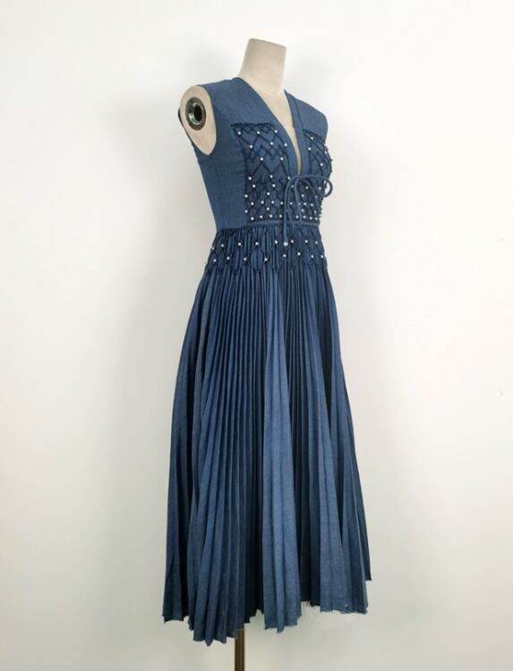 高品質!デニムドレス ブルーカラードレス Vカット ノースリーブ ワンピース ミディアムドレス パーティードレス