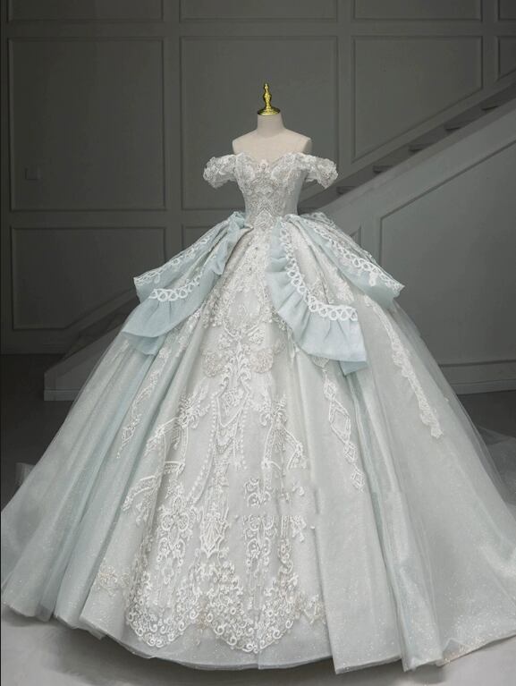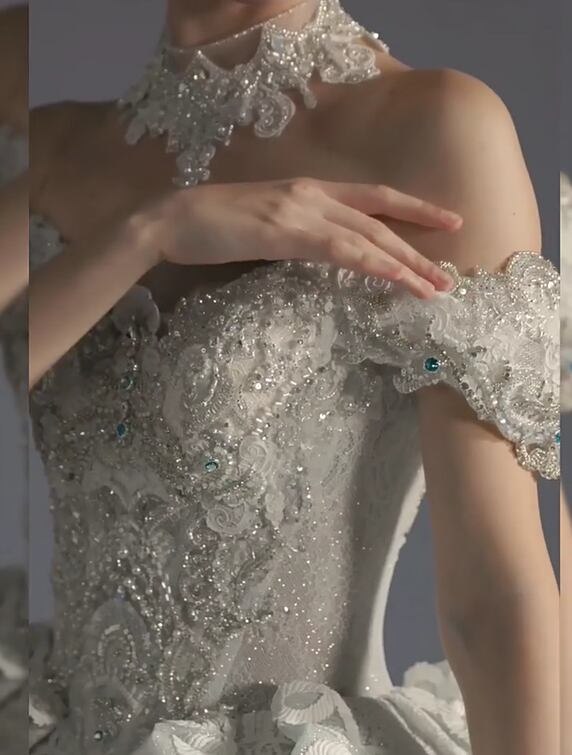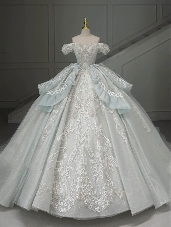 豪華!ビジュードレス ウエディングドレス プリンセスライン オフショルダー ビーディング ロングトレーン ボリュームドレス パーティードレス