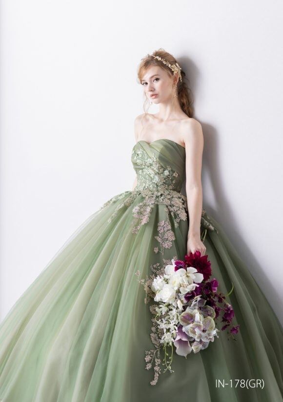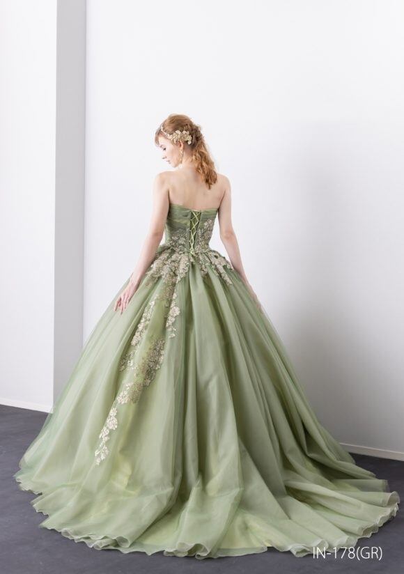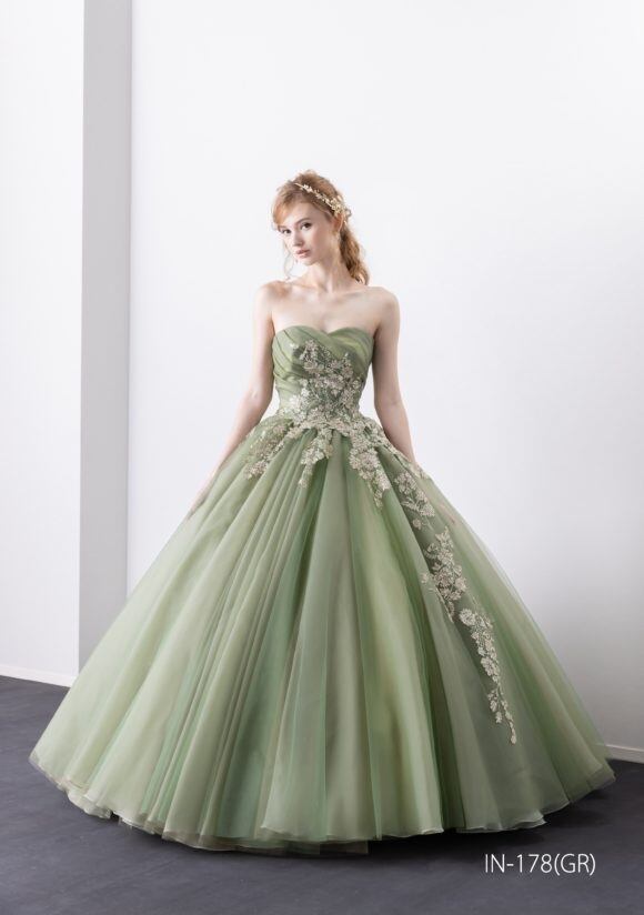 上品!グリーンカラードレス レースアップリケ プリンセスライン パーティードレス 演奏ドレス【色変更可能】