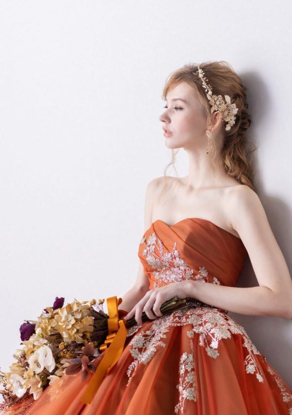 上品!テラコッタ色 オレンジカラードレス レースアップリケ プリンセスライン パーティードレス 演奏ドレス【色変更可能】
