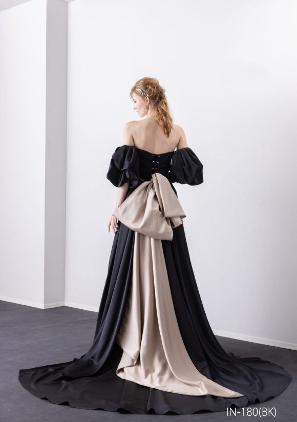 上品!黒 ブラックカラードレス パフスリーブ バイカラー ストレートスタイル パーティードレス 演奏ドレス【色変更可能】