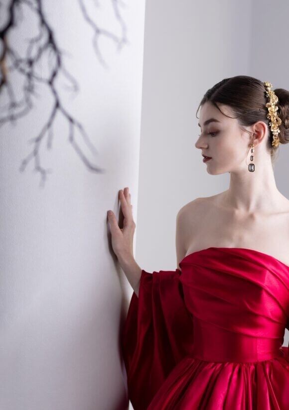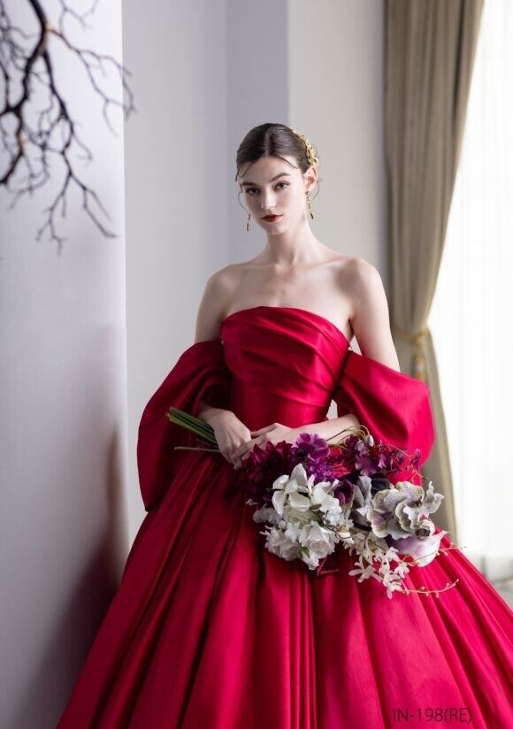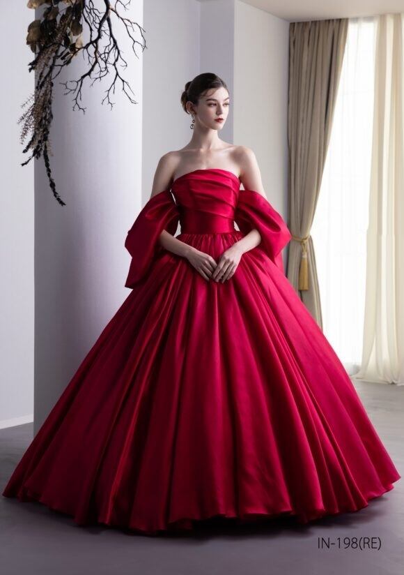 上品!鮮やかなレッドカラードレス 付け袖 プリンセスライン バックリボン パーティードレス 演奏ドレス【色変更可能】