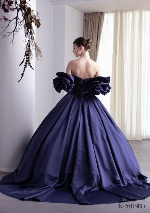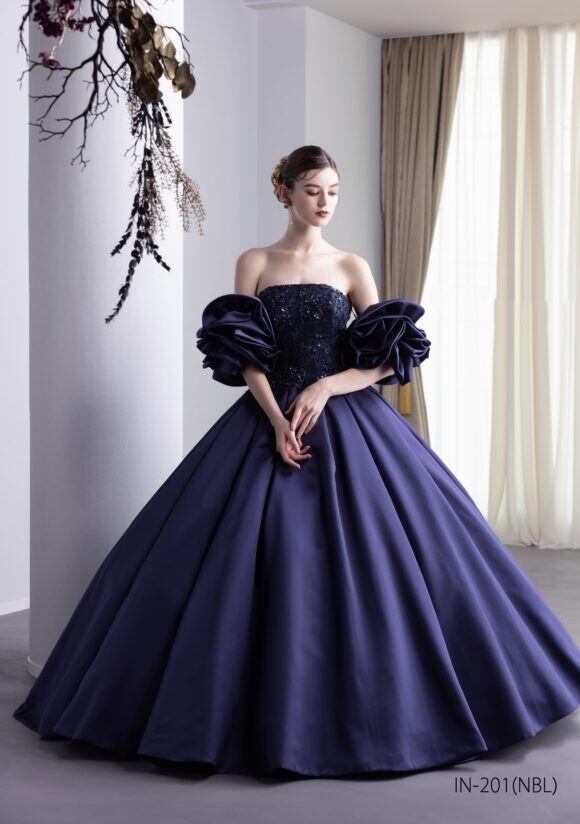 上品!ネイビーブルーカラードレス 付け袖 プリンセスライン ミディアムドレス パーティードレス 演奏ドレス【色変更可能】