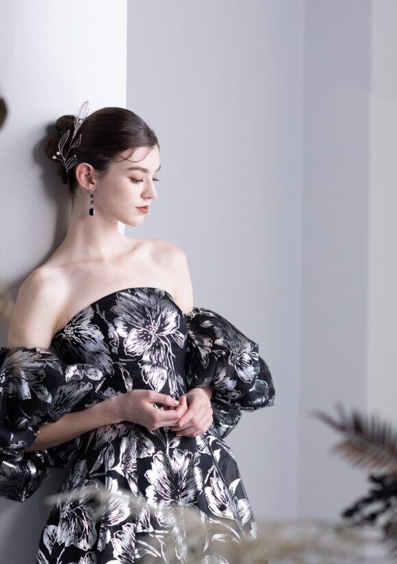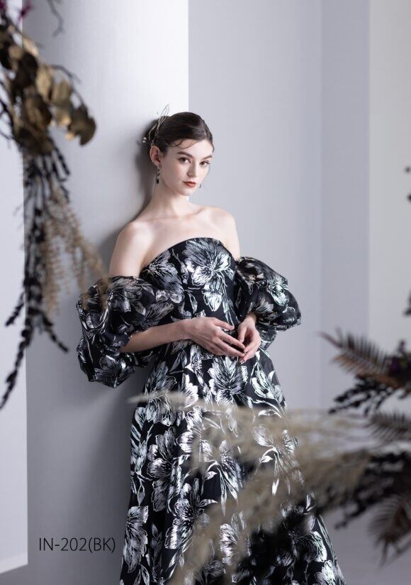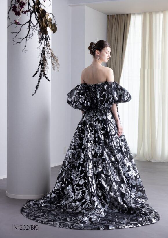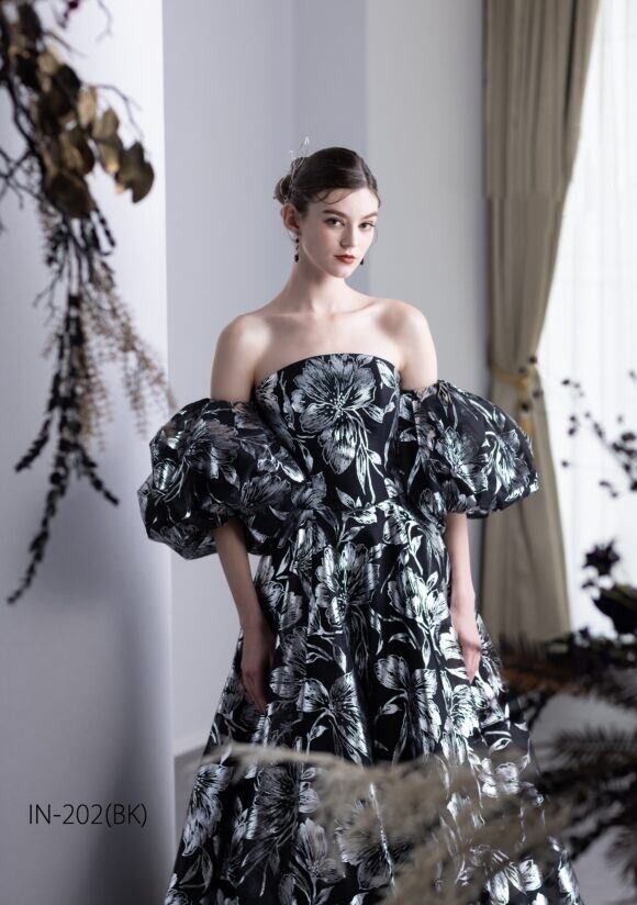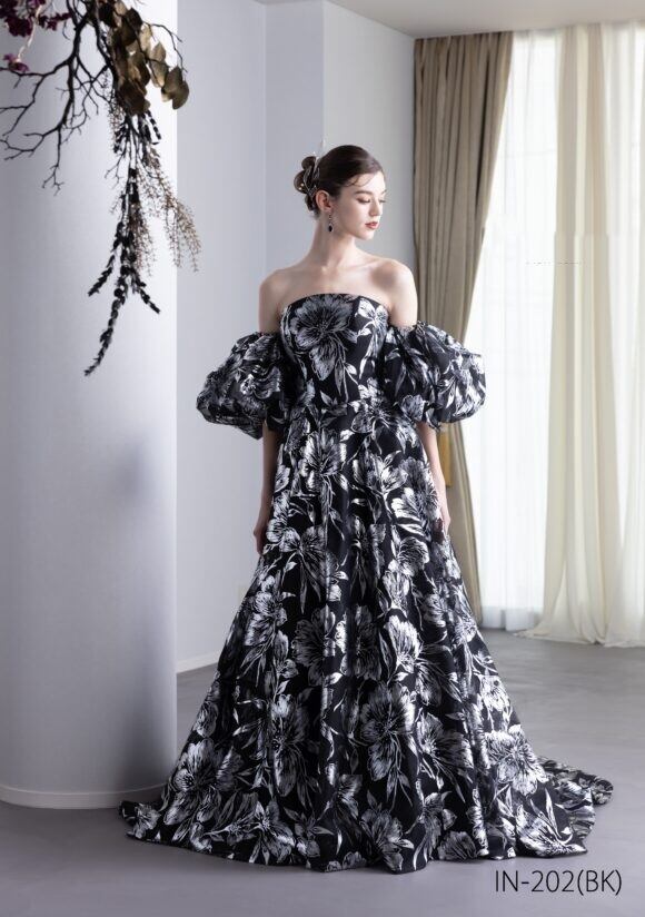 上品!黒 ブラックカラードレス パフスリーブ 花柄 ストレートスタイル パーティードレス イブニングドレス 演奏ドレス