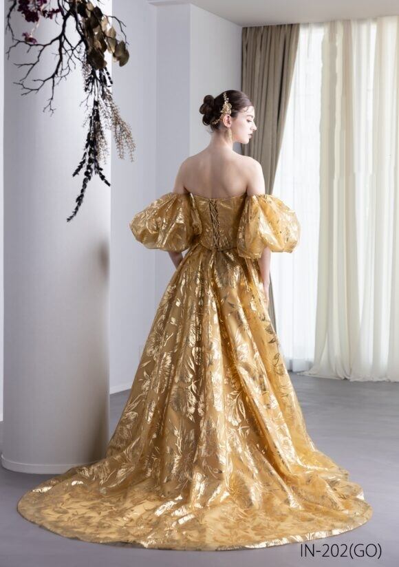 上品!ゴールドカラードレス パフスリーブ 花柄 ストレートスタイル パーティードレス イブニングドレス 演奏ドレス
