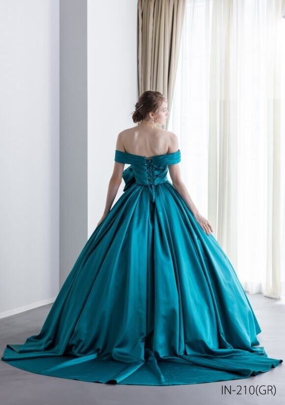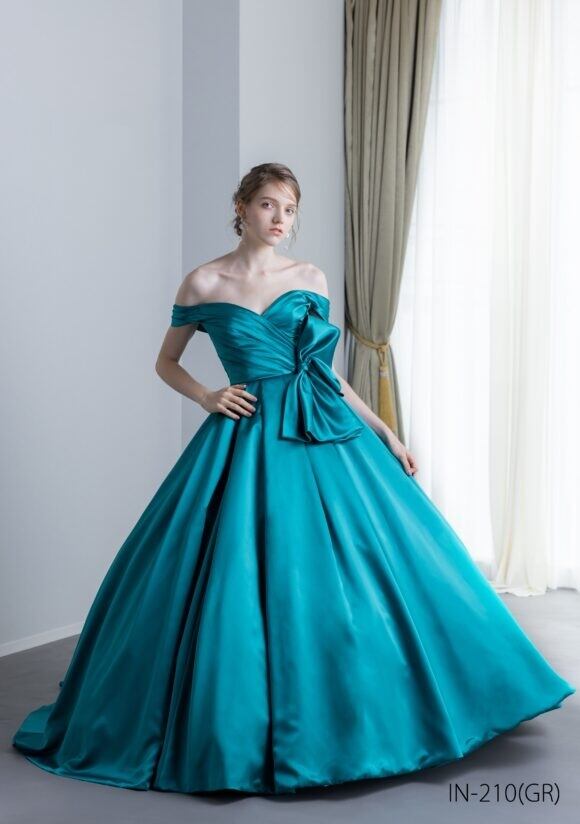 上品!ターコイズブルー カラードレス オフショルダー 取り外しリボン プリンセスライン ミディアムドレス パーティードレス【色変更可能】