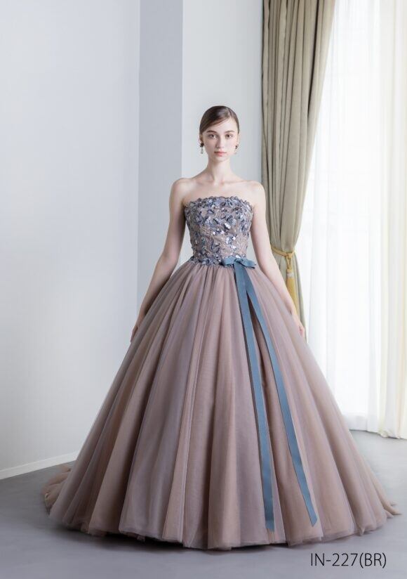 上品!コーヒーブラウン カラードレス ベアトップ プリンセスライン ウエストリボン パーティードレス 演奏ドレス【色変更可能】