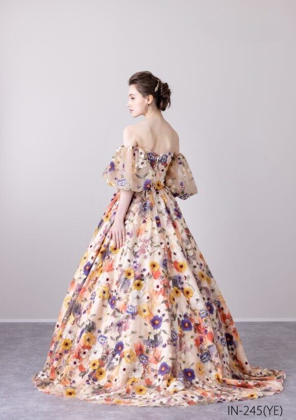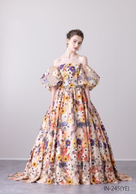 上品!フラワーモチーフ カラードレス パフスリーブ エンブロイダリーレース 花柄 ストレートスタイル パーティードレス イブニングドレス 演奏ドレス