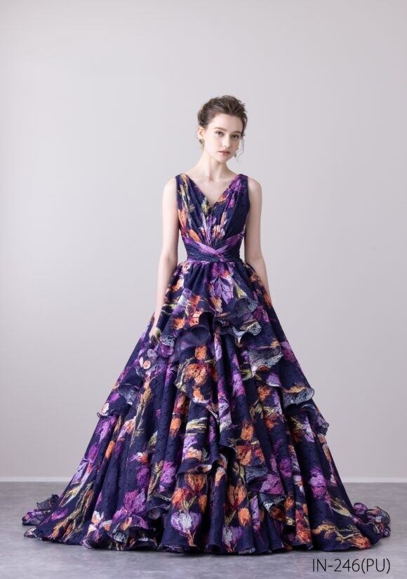 上品!フラワーモチーフ 濃いパープルカラードレス フリル ノースリーブ エンブロイダリーレース 花柄 パーティードレス イブニングドレス 演奏ドレス