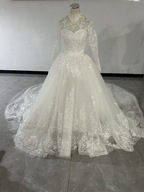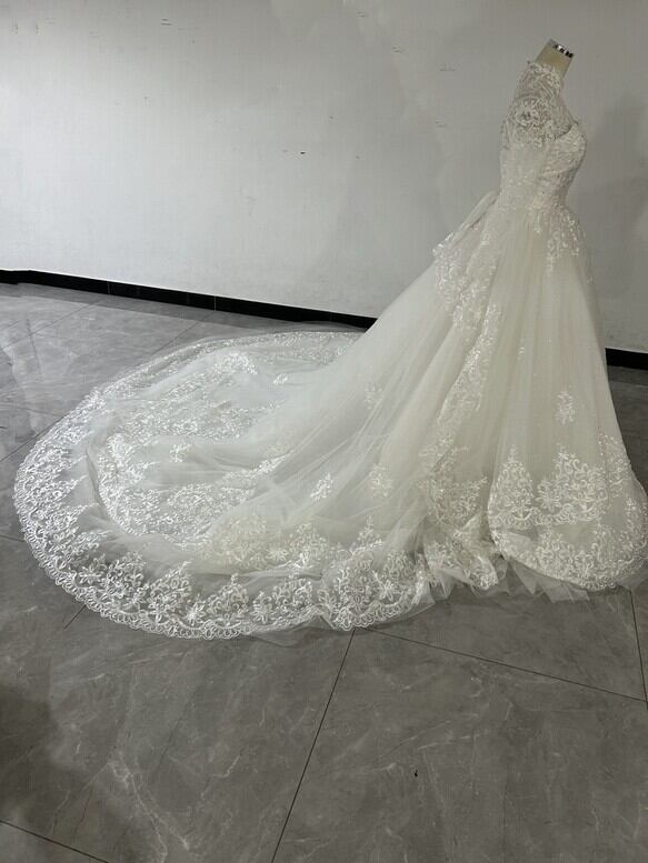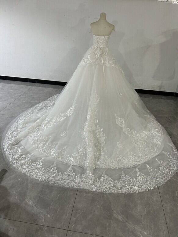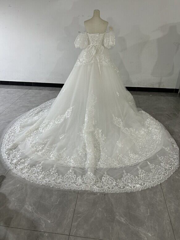 上品!オフホワイト 3D立体レース刺繍 ウエディングドレス 華やかなトレーン+ 3D立体レース刺繍トッ トップス演奏ドレス