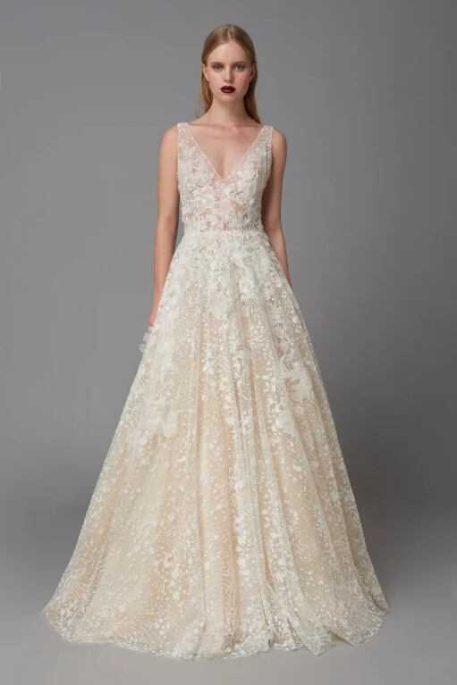 上品!ヨーロッパ風 ウエディングドレス アイボリー色 パーティードレス ディープVネック/深いV開き 総レースドレス ノースリーブ 繊細刺繡