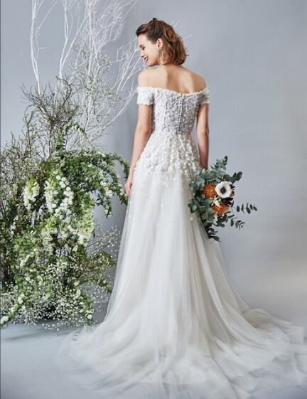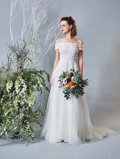 上品!ウエディングドレス 半袖 3D小花レースドレス スレンダーライン オフショルダー エンパイアライン 結婚式/前撮り【オーダーメイド】