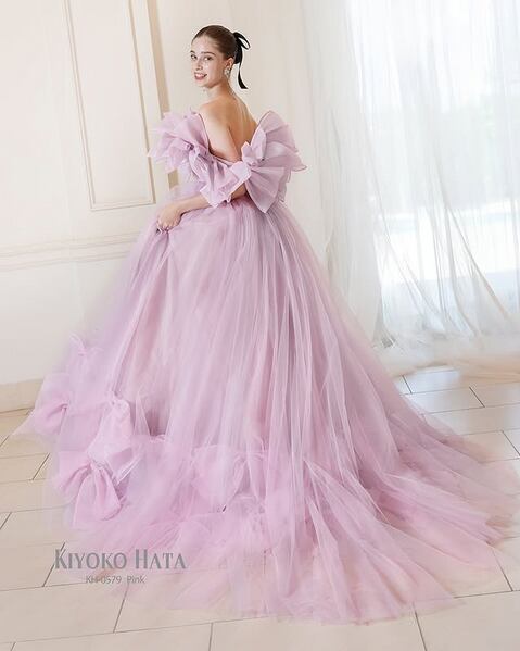 美品!リボン ピンク紫 カラードレス 取り外しオフショルダー ボリュームドレス ミディアムドレス パーティードレス【色変更可能】