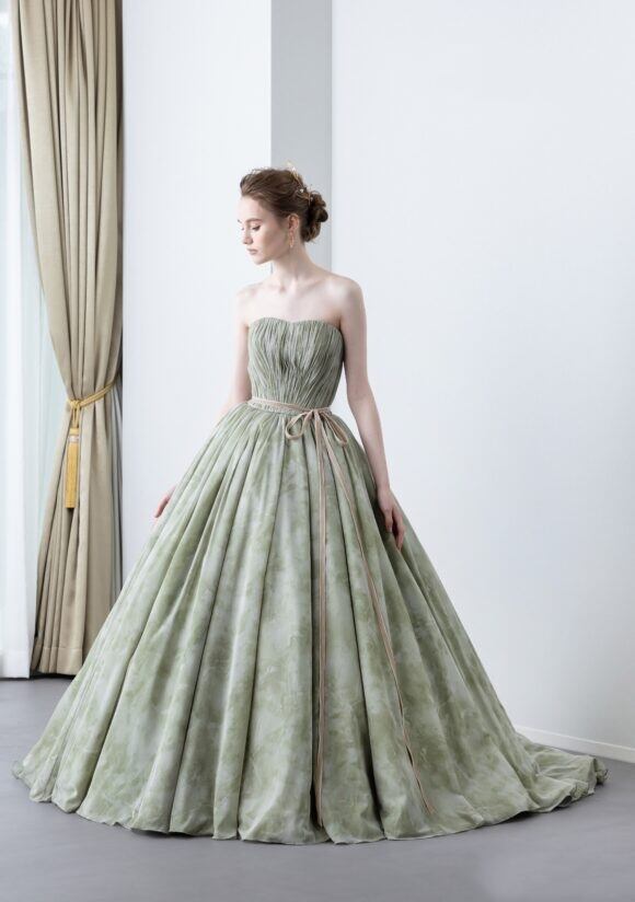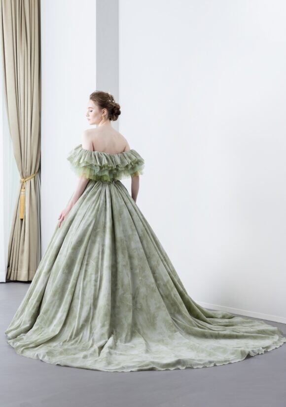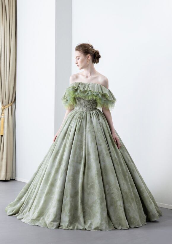 上品!取り外しオフショルダー 薄グリーン カラードレス ウエストリボン 花柄 パーティードレス イブニングドレス 演奏ドレス