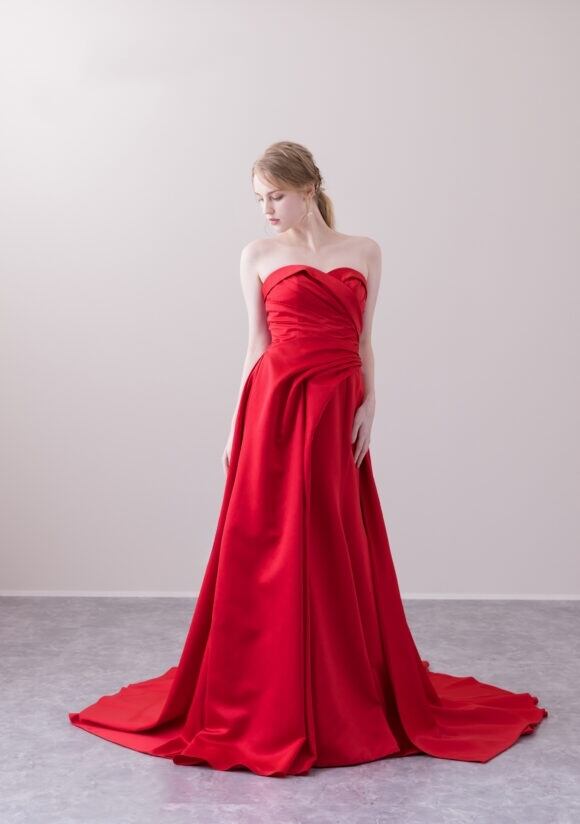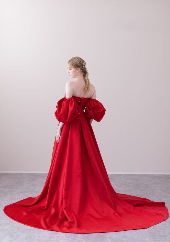 上品!レッド/赤 カラードレス パフスリーブ バックリボン Aラインドレス ミディアムドレス パーティードレス【色変更可能】