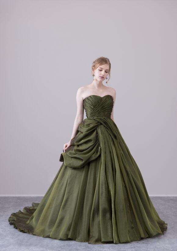 上品!まっちゃ色 グリーン カラードレス パフスリーブ バックリボン Aラインドレス ミディアムドレス パーティードレス【色変更可能】