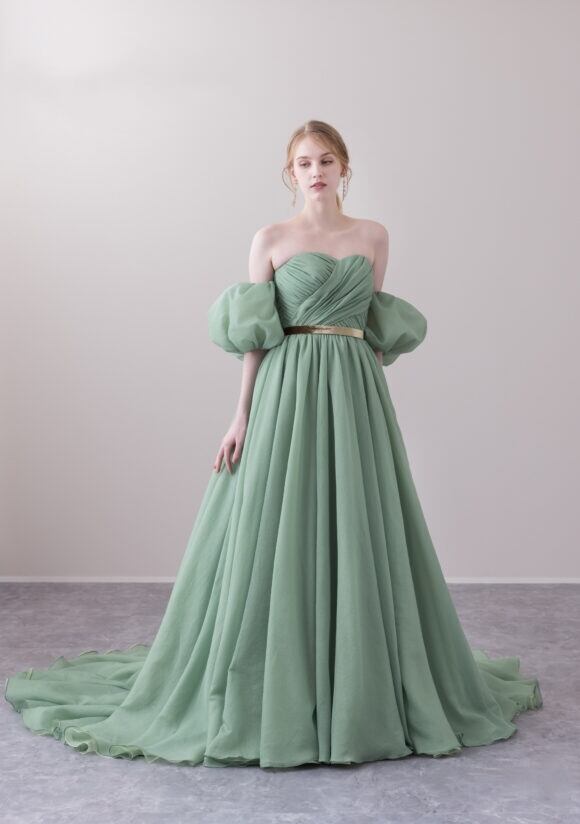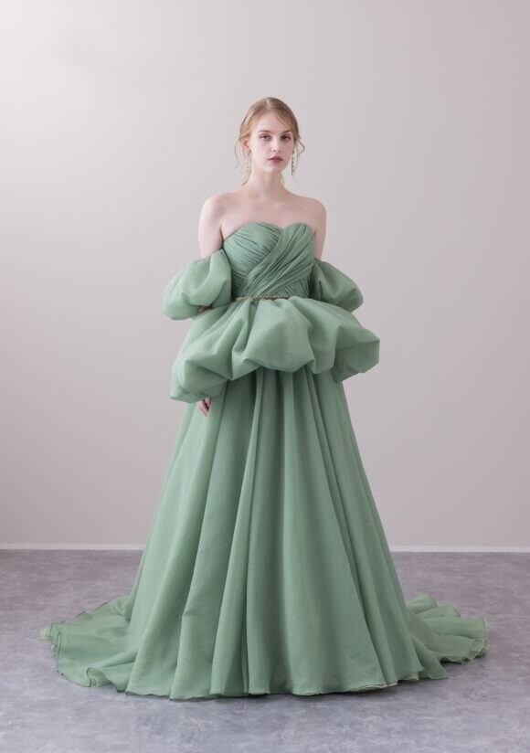 上品!ミントグリーン カラードレス パフスリーブ バルーンスタイル ミディアムドレス パーティードレス【色変更可能】