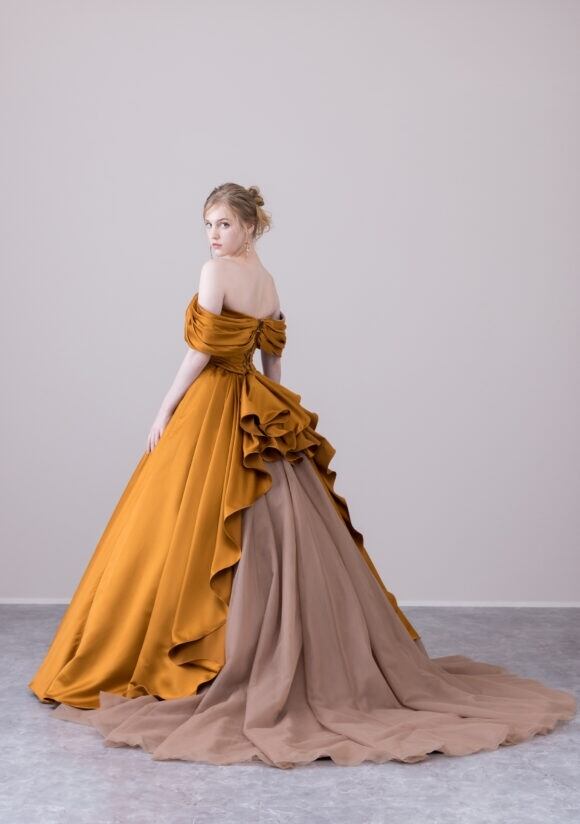 上品!マスタード色 カラードレス オフショルダー ラッフルフリル チュールトレーン ミディアムドレス パーティードレス【色変更可能】