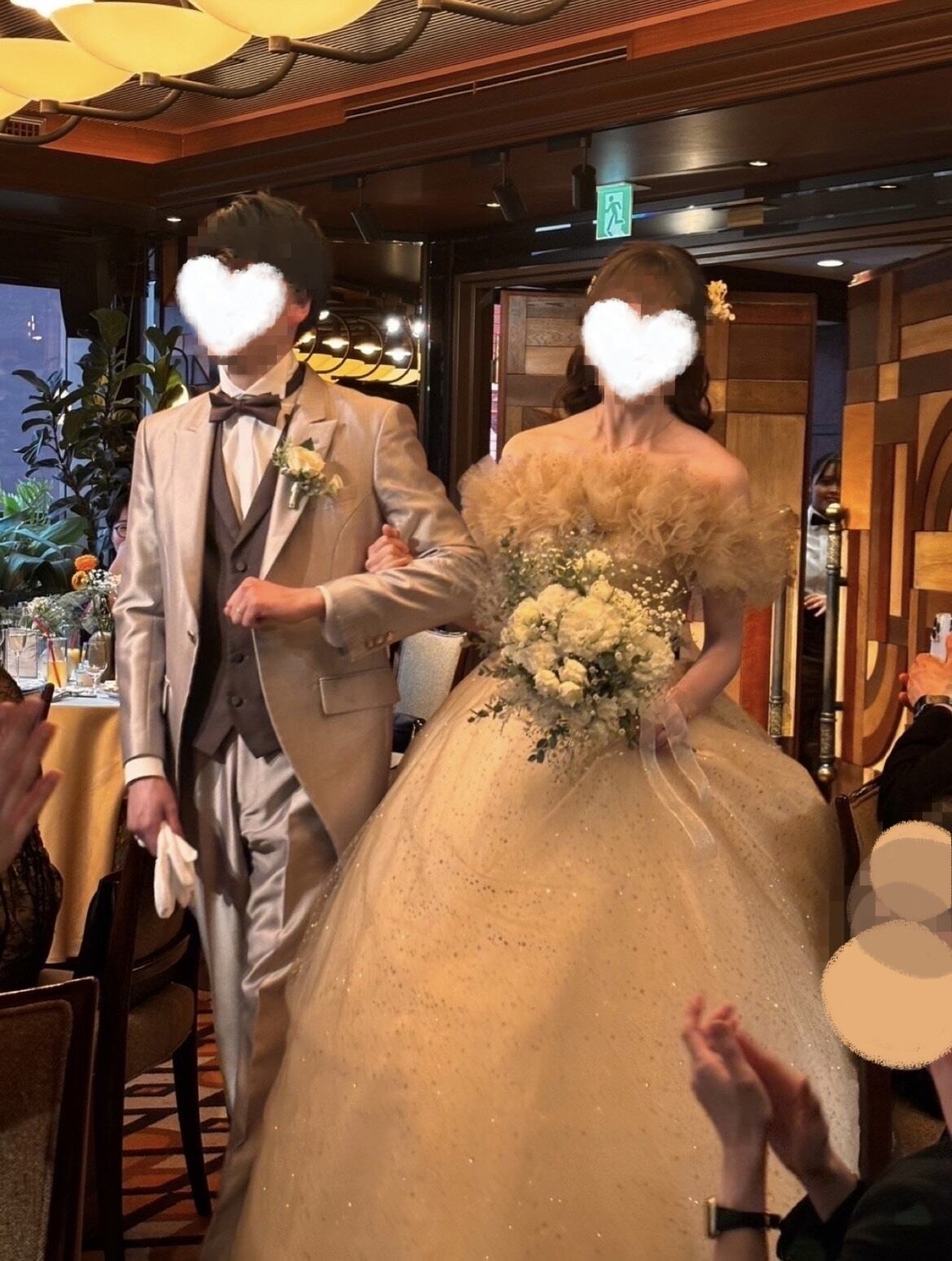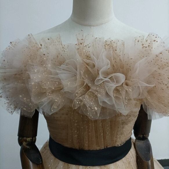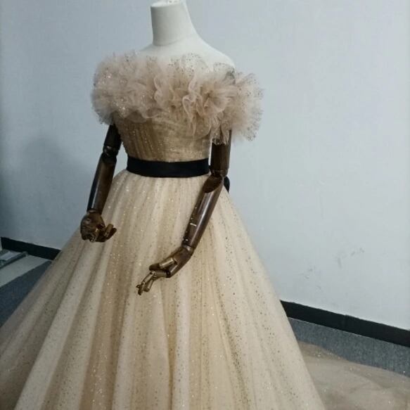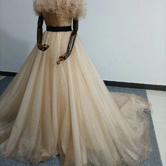 実例写真 上品 カラードレスシャンパン色 ソフトチュール ロングトレーン 取り外しオフショルダー 結婚式/披露宴 二次会