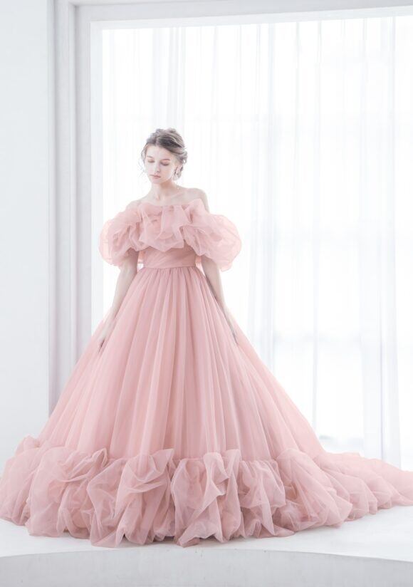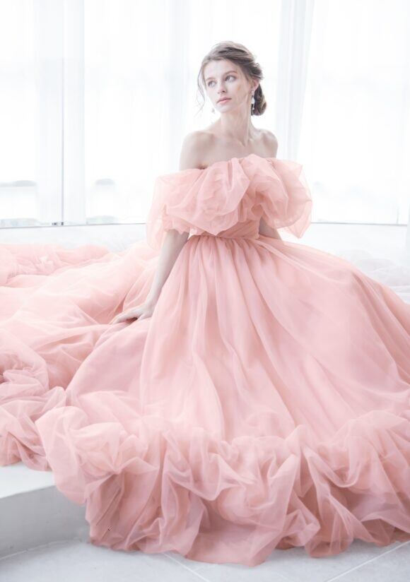 上品!桜色 薄ピンク カラードレス バルーンスタイル ふわふわ裾 オフショルダー ミディアムドレス パーティードレス【色変更可能】