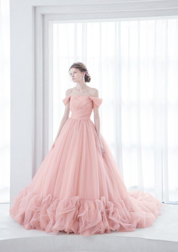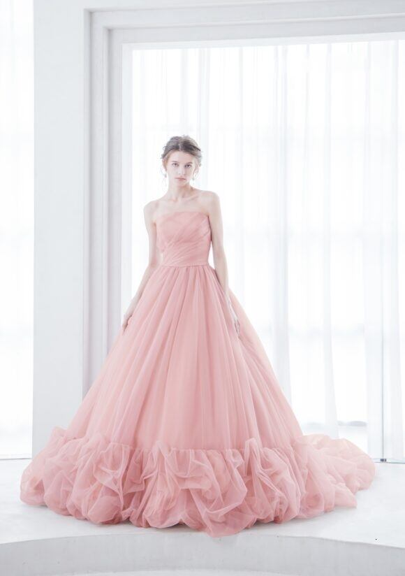 美品!桜色 薄ピンク カラードレス バルーンスタイル ふわふわ裾 付け袖 ミディアムドレス パーティードレス【色変更可能】