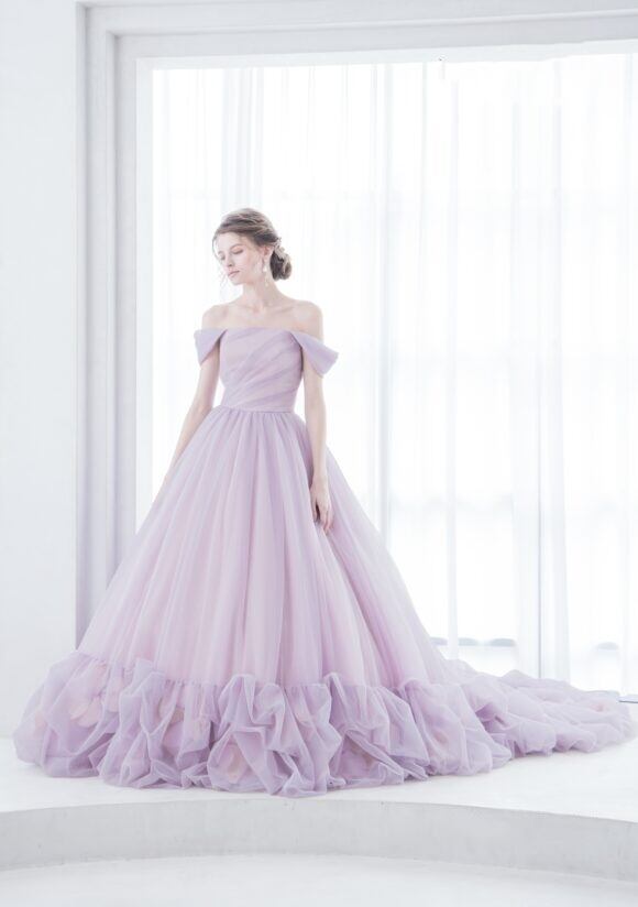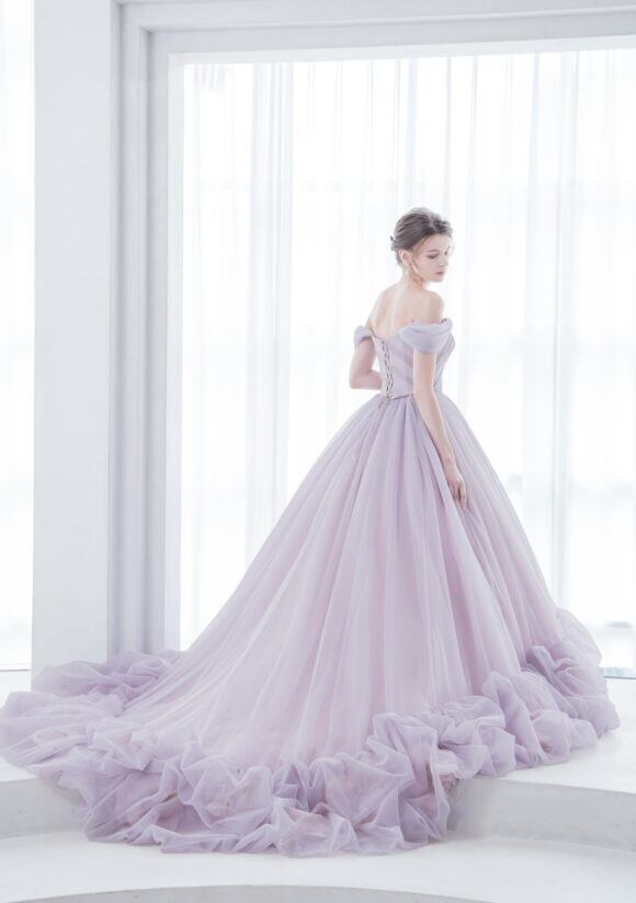 美品!ライトパープル ラベンダー色 カラードレス バルーンスタイル ふわふわ裾 付け袖 ミディアムドレス パーティードレス【色変更可能】