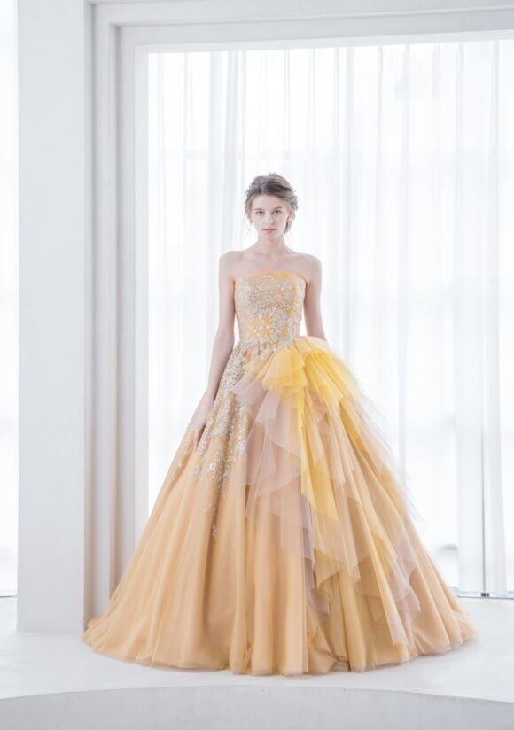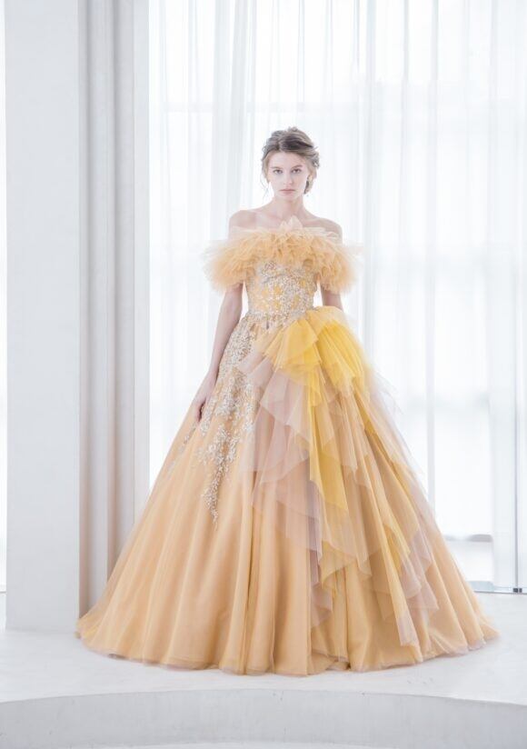 上品!マスタード色 イエロー/黄色 カラードレス フリルオフショルダー 繊細レース チュールドレス ミディアムドレス パーティードレス【色変更可能】