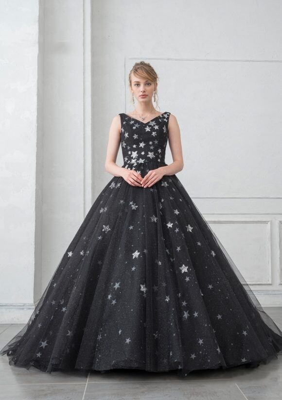 上品!ブラックカラードレス キラキラスターモチーフ ノースリーブ 星空ドレス イブニングドレス パーティードレス【色オーダー可能】